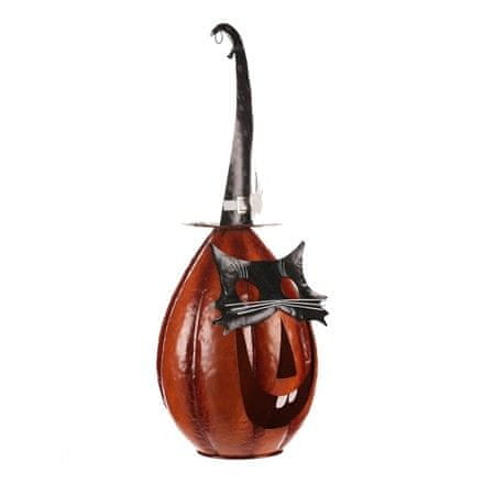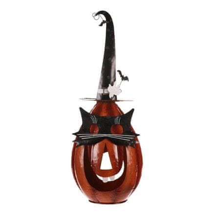 Oranžna kovinska buča s koničastim klobukom in mačjo masko izgleda strašljivo, a njen vesel izraz nakazuje, da groza ne bo tako huda. Idealna dekoracija za noč čarovnic in jesenske večere, ki bo razveselila vse, ki imajo radi malo skrivnosti z nasmehom.