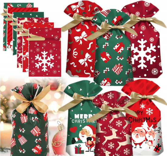 Darilne vrečke – folijske torbice z vrvico, različni praznični motivi, komplet 6 kosov 🎄