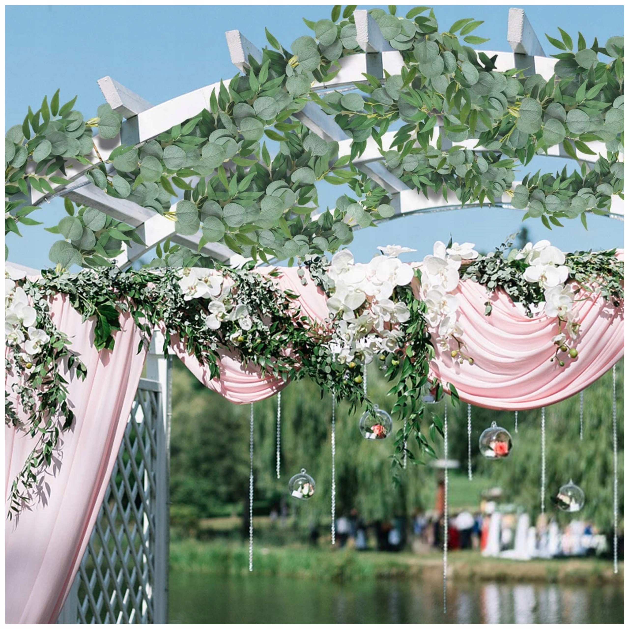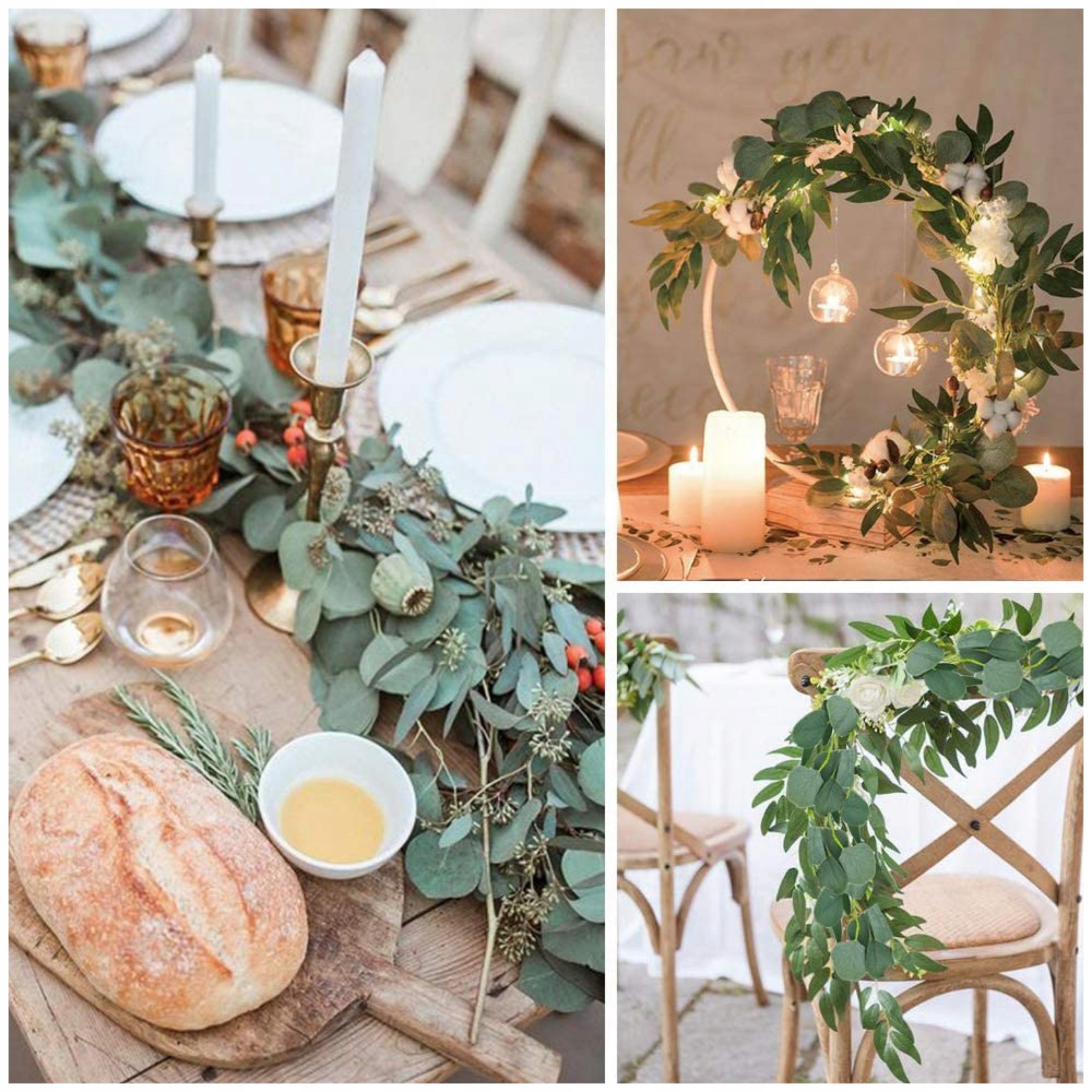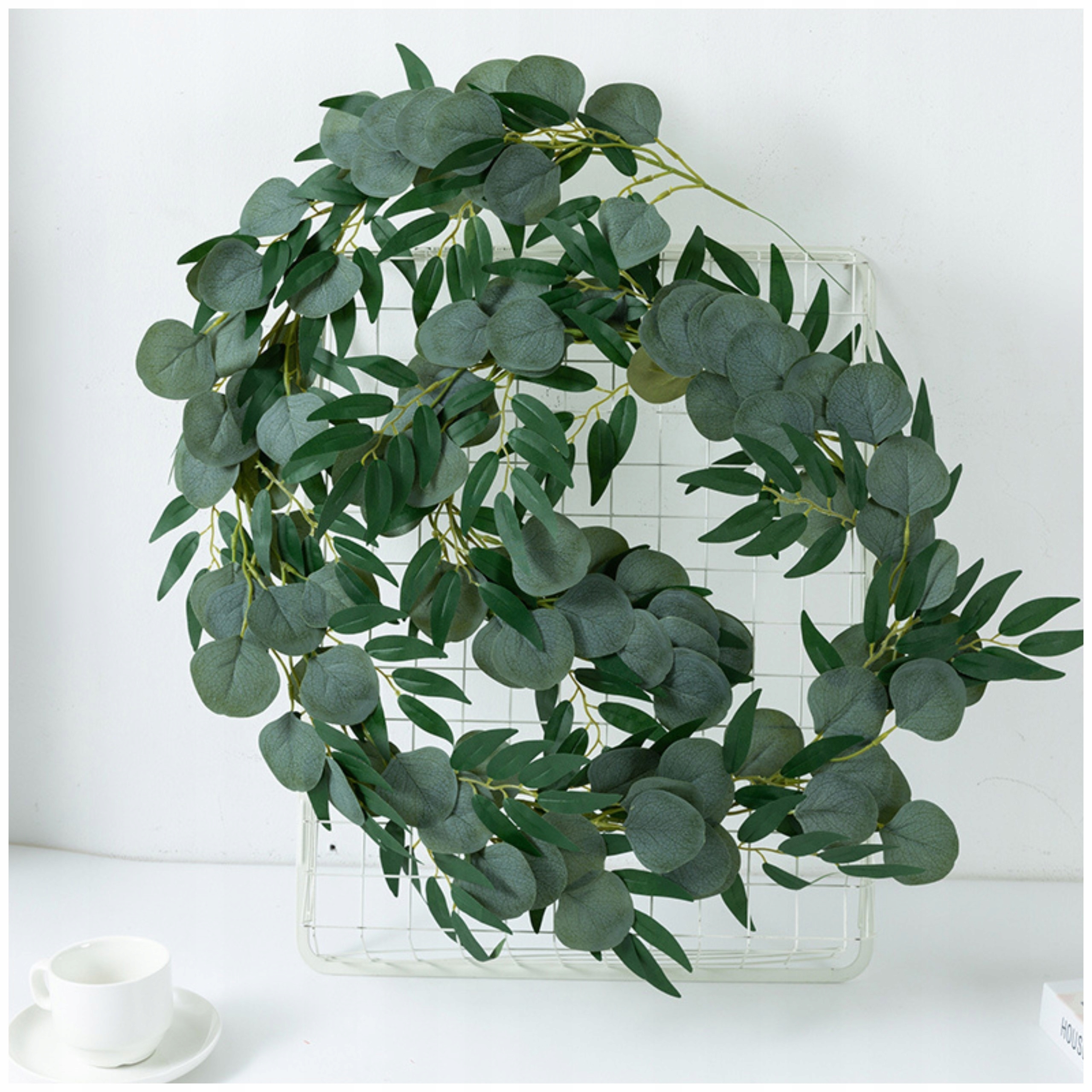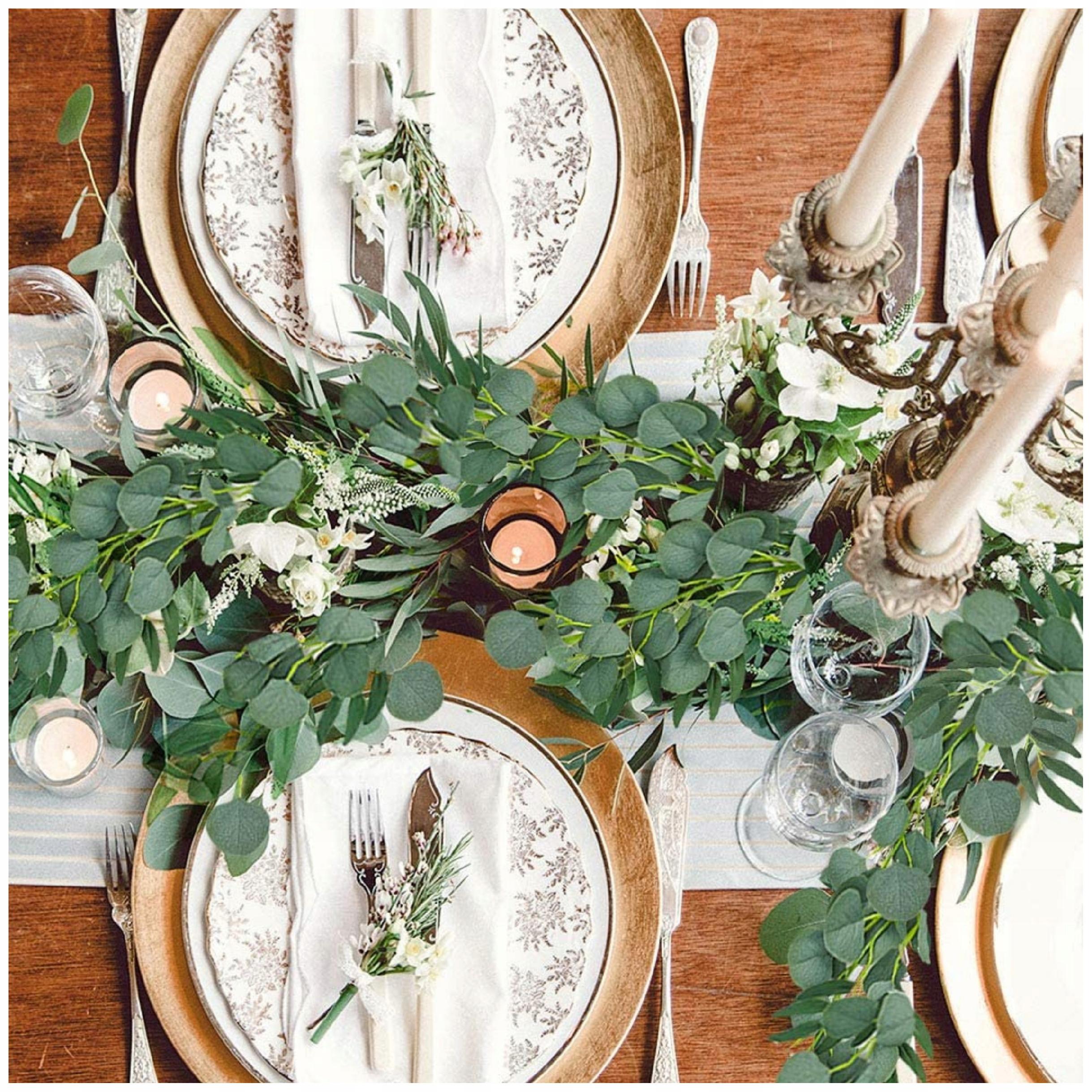 Modna dekoracija: Umetna girlanda iz evkaliptusa je zelo modna in se pogosto uporablja kot dekorativni element na vseh posebnih dogodkih: porokah, rojstnih dnevih, obhajilih.