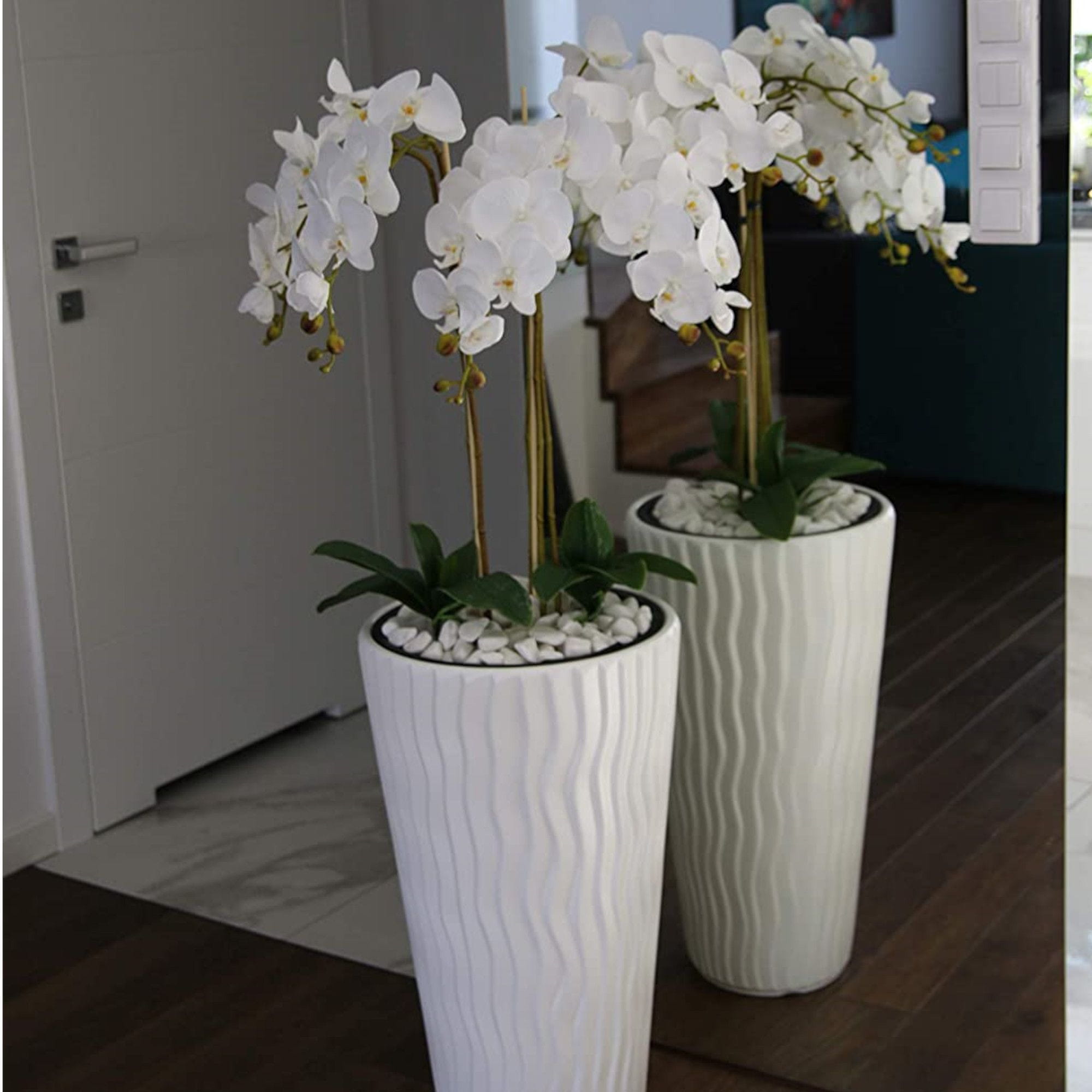 Ponujena kompozicija je bila ustvarjena s pozornostjo do detajlov, da se zagotovijo najvišje dekorativne lastnosti. Umetna orhideja v visokem plastičnem loncu, idealna za notranjo opremo, stanovanja, hiše, dnevne sobe, pisarne ali delovne sobe. Lahko je tudi odlična ideja za darilo. Orhideja je izdelana iz zelo kvalitetne plastike, izgleda kot prave rože. Stebla so zelo močna in prožna, kar nam daje možnost, da jih upogibamo pod različnimi koti. Največja prednost tega izdelka je, da ne zahteva posebne nege, dovolj je, da liste obrišete z vlažno krpo in posušite cvetove. Roža je v posebnem vložku, ki se enostavno izvleče. Vrh substrata je obložen z belimi kamni, ki tehtajo približno 3 kg, dodajo čar in odlično tvorijo celotno kohezijo z loncem, kar zagotavlja dodatno obremenitev, ki naredi celoto zelo stabilno.
