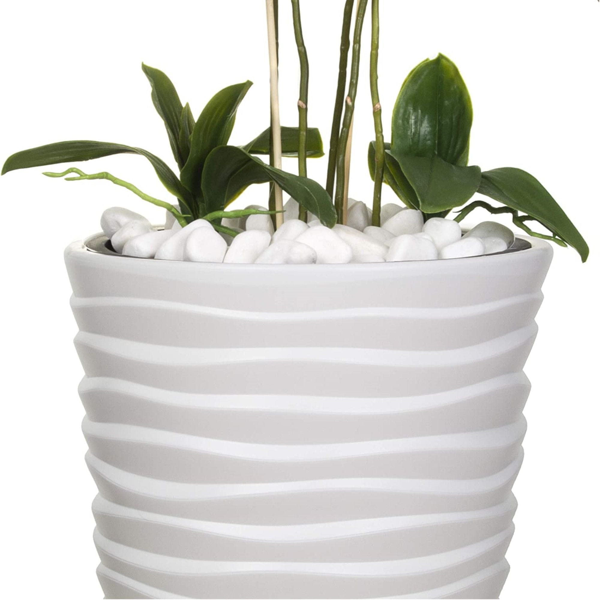Ponujena kompozicija je bila ustvarjena s pozornostjo do detajlov, da se zagotovijo najvišje dekorativne lastnosti. Umetna orhideja v visokem plastičnem loncu, idealna za notranjo opremo, stanovanja, hiše, dnevne sobe, pisarne ali delovne sobe. Lahko je tudi odlična ideja za darilo. Orhideja je izdelana iz zelo kvalitetne plastike, izgleda kot prave rože. Stebla so zelo močna in prožna, kar nam daje možnost, da jih upogibamo pod različnimi koti. Največja prednost tega izdelka je, da ne zahteva posebne nege, dovolj je, da liste obrišete z vlažno krpo in posušite cvetove. Roža je v posebnem vložku, ki se enostavno izvleče. Vrh substrata je obložen z belimi kamni, ki tehtajo približno 3 kg, dodajo čar in odlično tvorijo celotno kohezijo z loncem, kar zagotavlja dodatno obremenitev, ki naredi celoto zelo stabilno.
