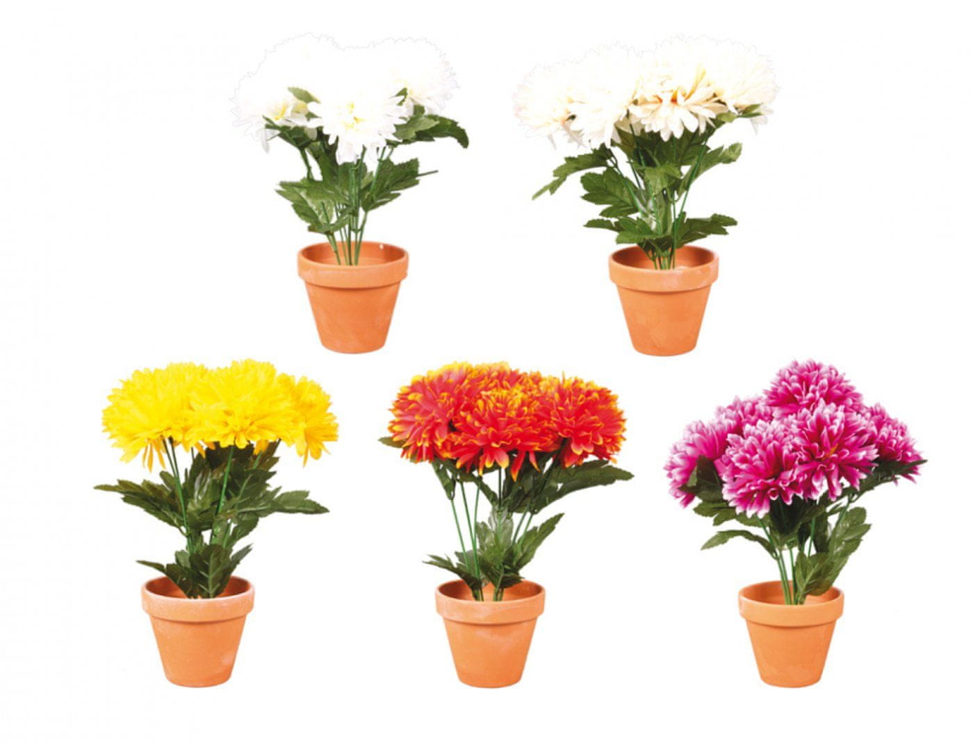 Umetni cvet krizanteme v keramičnem lončku iz terakote. Mešanica barv: bela, oranžna, rumena, svetlo rumena, temno rožnata. Višina: 21 cm.