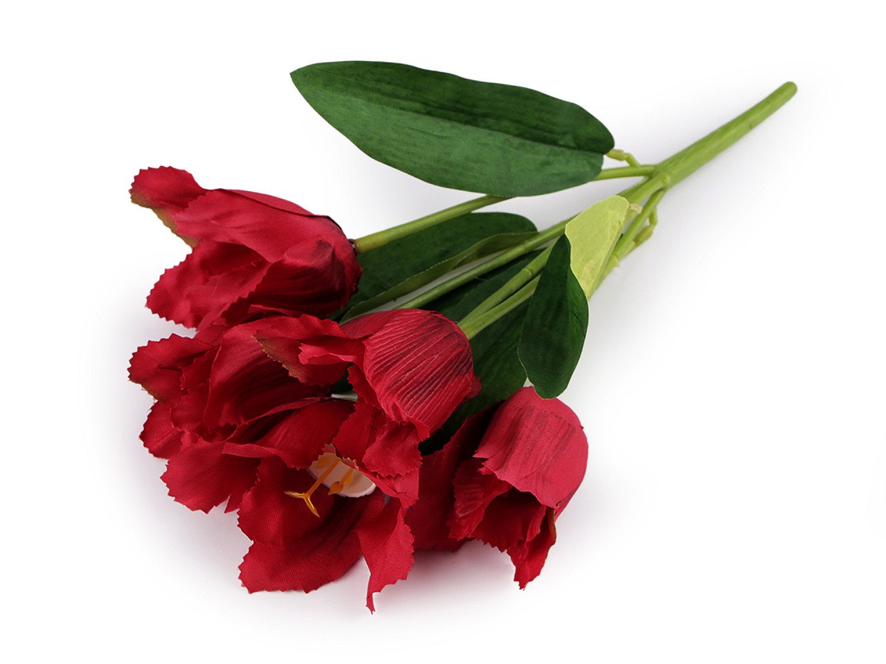 Šopek tulipanov bo izstopal v preprosti vazi. Lahko pa ga uporabite tudi za dekorativne vezi, ikebane, vence in spomladanske aranžmaje. Šopek je sestavljen iz 5 stebel s cvetovi in žico v notranjosti. Premer cveta je približno 6 cm, njegova dolžina je prav tako približno 6 cm.