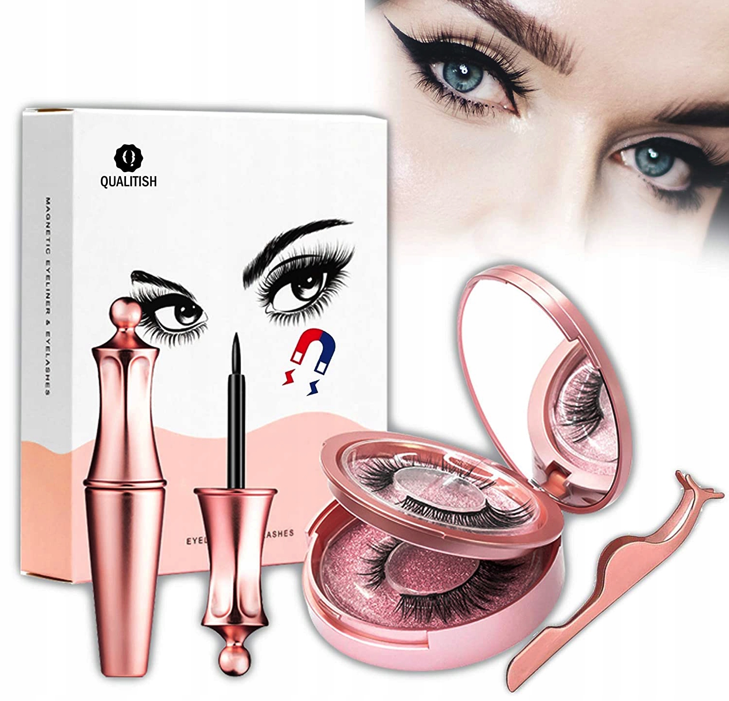 Komplet magnetnih trepalnic z očesnim črtalom vključuje 2 para magnetnih umetnih trepalnic , pinceto in črtalo za oči + 5 parov nemagnetnih umetnih trepalnic in črtalo za oči. Lahko ga vzamete s seboj kamor koli in je zelo priročen. Komplet magnetnih trepalnic vključuje ogledalo, s katerim lahko trepalnice nastavite kjer koli in kadar koli.