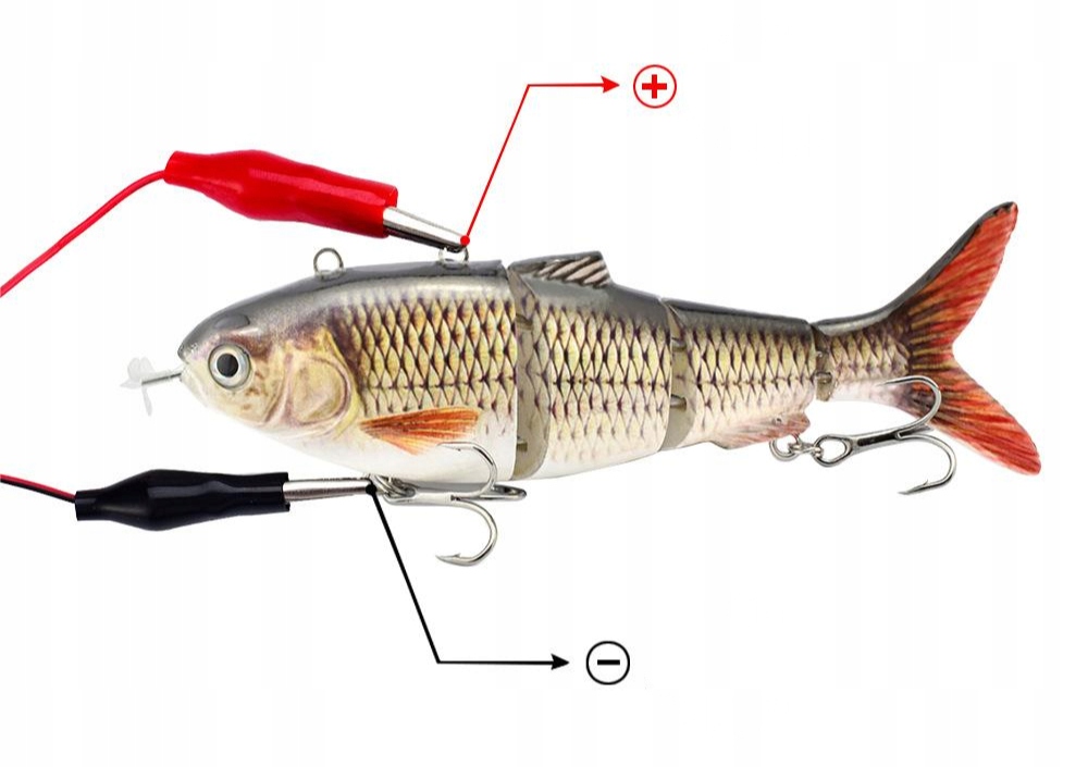 Riba se polni preko USB kabla (priključenega na standardni polnilnik, prenosnik ali powerbank) in na ribo po diagramu – rdeča pri prvem zgornjem očescu, črna pri spodnjem prvem trnku.