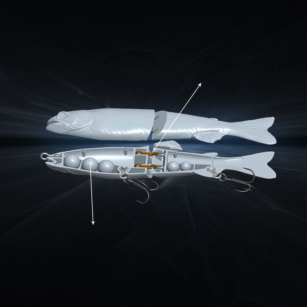 - Kovinske povezave: Omogočajo naravno in gladko gibanje v vodi, ki posnema gibanje žive ribe.