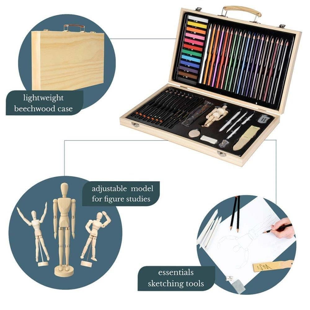 Lesen kovček z različnimi pripomočki in materiali za skiciranje. Vsebuje: 18 × barvnih svinčnikov 12 × mehkih pastel 7 × svinčnikov za skiciranje 4 × ogljene palčke (vinsko oglje) 4 × papirnate mešalne palčke (za senčenje) 3 × ogljene svinčnike 1 × radirko 1 × gnetljivo radirko 1 × šilček 1 × … Celoten opis
