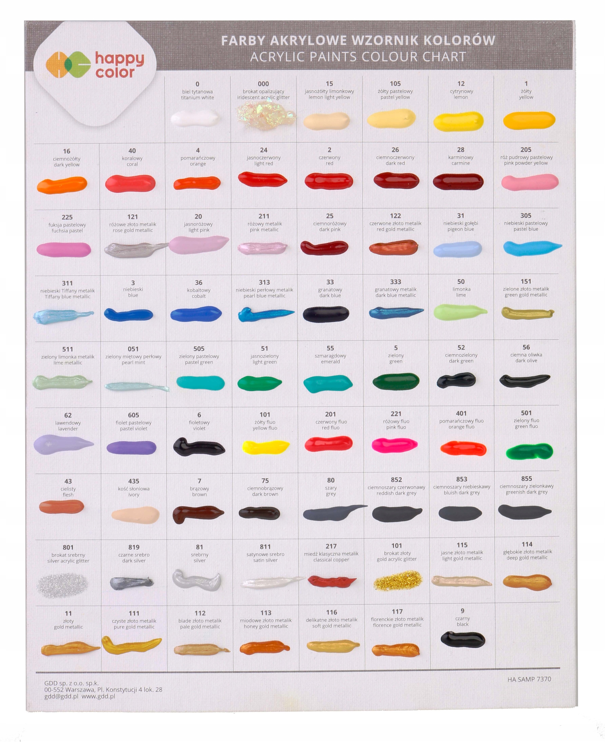 Akrilna barva znamke Happy Color, prostornina 75 ml , trenutno na voljo v 34 osnovnih barvah, 20 kovinskih barvah, 6 pastelnih barvah in 5 neonskih barvah, z različnimi stopnjami motnosti.