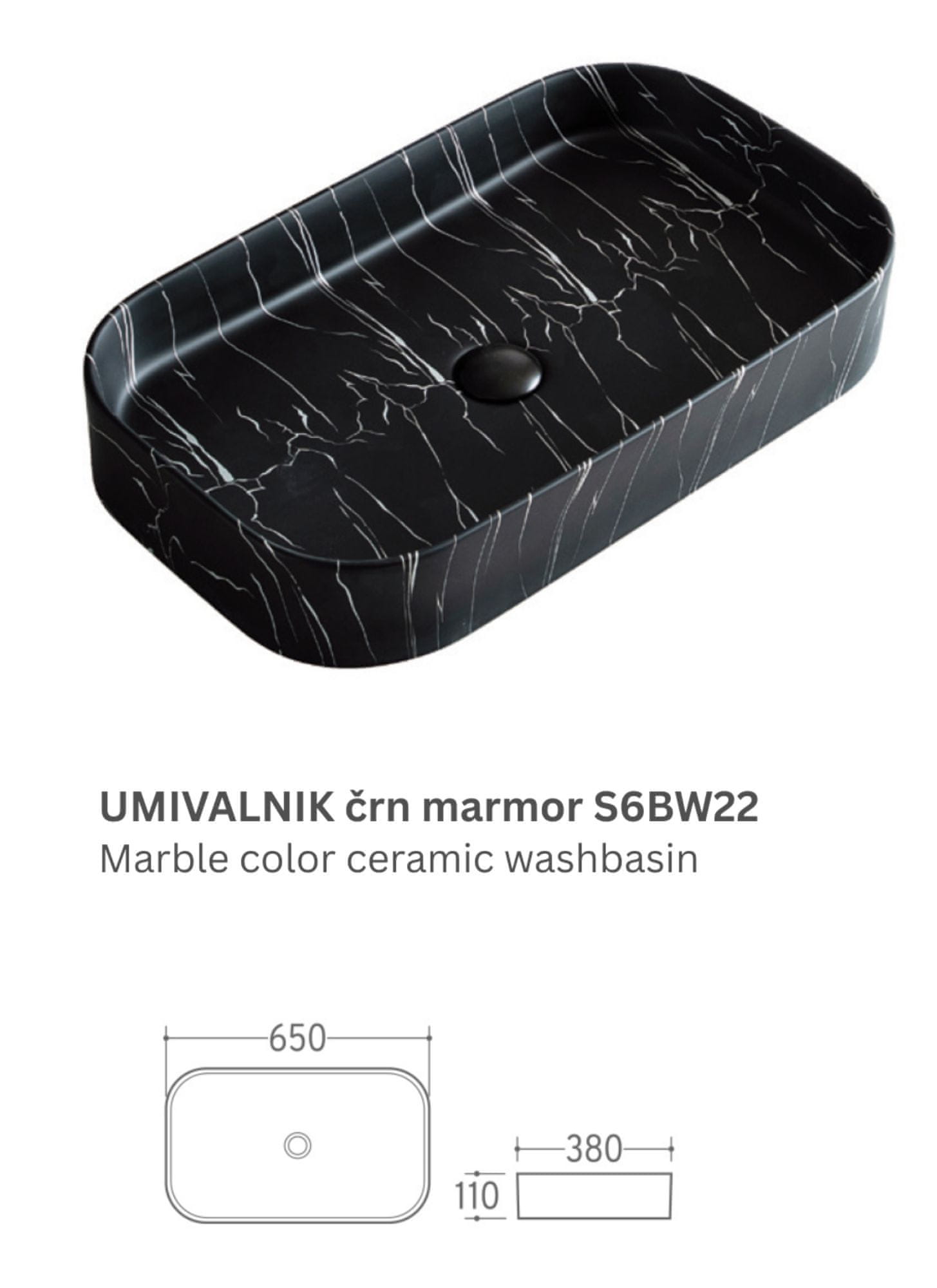 S6 Steklarstvo Šest UMIVALNIK črn marmor S6BW22, 65 × 38 × 11 cm