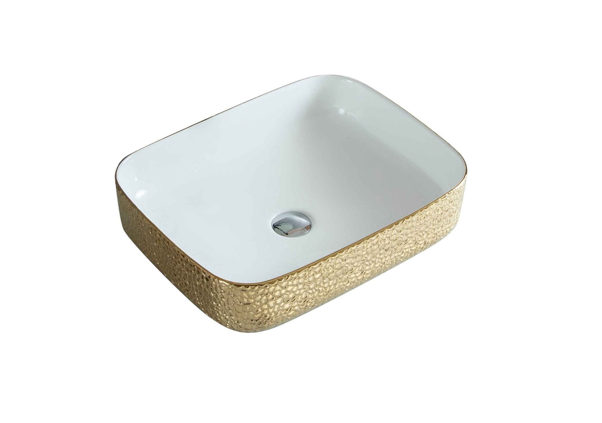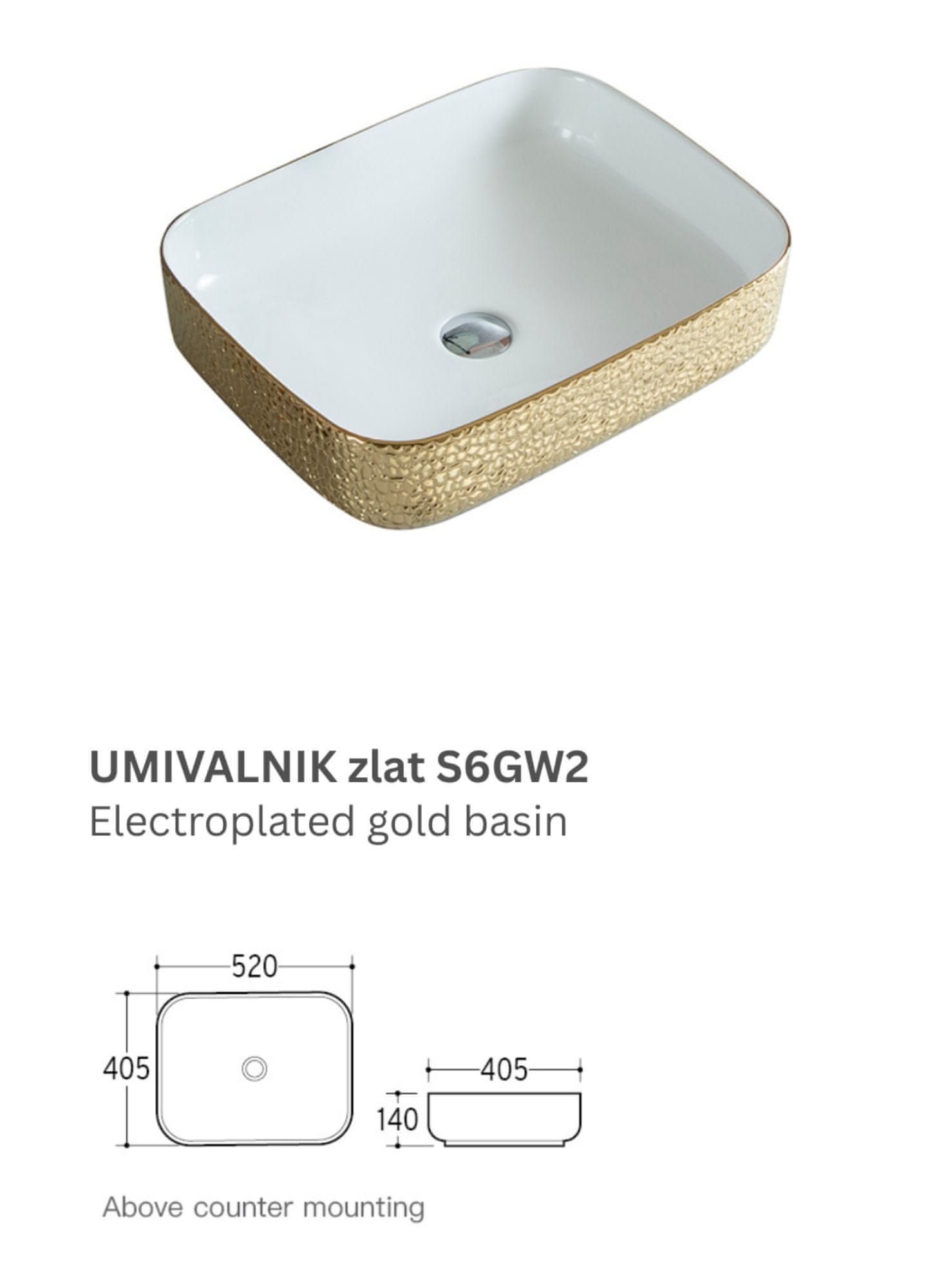 Dodajte svoji kopalnici sijaj in prefinjenost z umivalnikom zlat S6GW2, ki združuje visok sijaj zlate elektroprevleke z gladko belo notranjostjo.