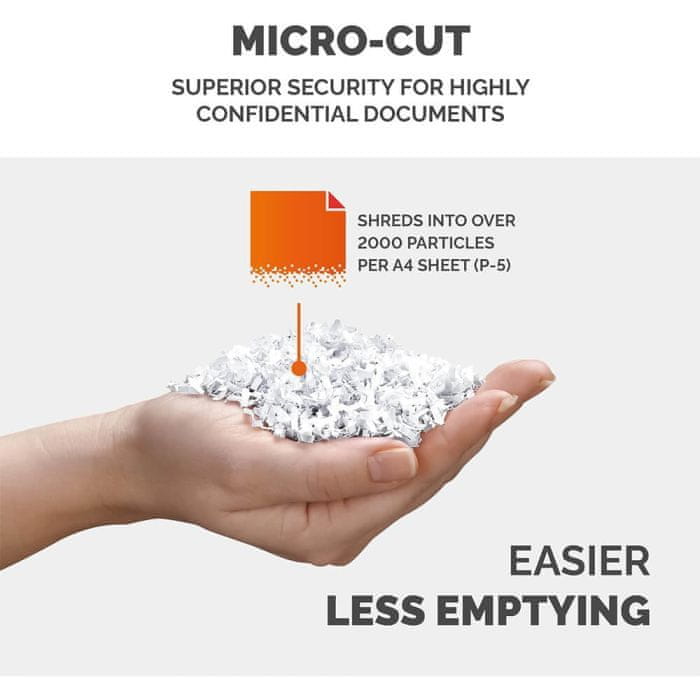 • Razreže 10 listov papirja naenkrat na 2 × 12 mm mikro rezane delce (varnostna stopnja P-5) – to je 2000+ delcev na list A4