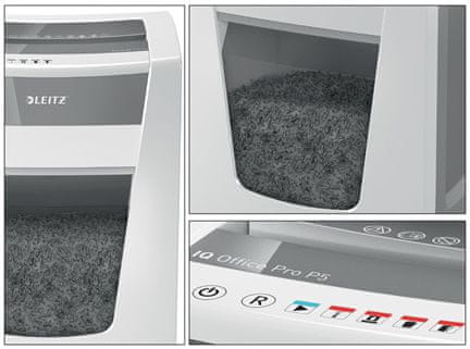 • Obsega tudi koš za ostanke uničenih dokumentov s prostornino 30 litrov oziroma do 300 odpadnih listov. Praznjenje koša je sila enostavno.