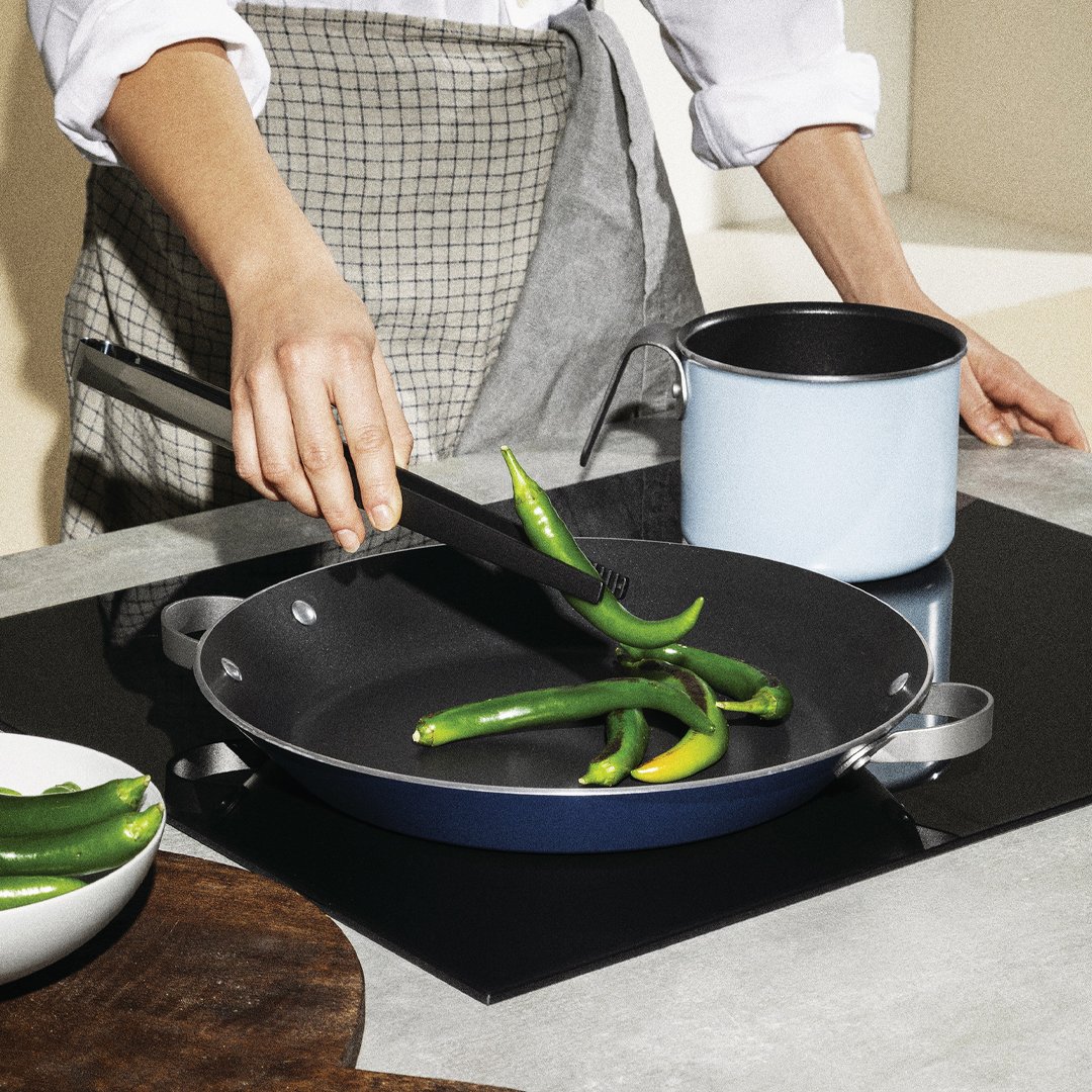 Linija kuhinjske posode Tama zaznamuje oblikovalski pristop italijanskega dizajnerja Giulia Iacchettija, ki je združil eleganten, preprost in minimalističen dizajn. Ponev Tama je izdelana iz 100% recikliranega aluminija v temno modri barvi, s 3-slojno notranjo prevleko proti prijemanju (brez PFOA, niklja, težkih kovin in bisfenola A) in mat ročaji iz nerjavečega jekla 18/10. S premerom 32 cm in višino 4,5 cm je idealna za pripravo različnih jedi… Uporabite jo lahko na vseh kuhalnih površinah, tudi na indukciji in v pečici do 250°C. Primerna je za pomivanje v pomivalnem stroju, vendar je priporočljivo ročno pranje. Oblikovalec je za linijo Tama izbral različne barvne različice za posamezne komponente, ki skupaj ustvarijo vsestransko in skladno celotno kompozicijo, ki se ujema s kuhinjami različnih stilov. NAMIG: Ponev dopolnite z ostalo kuhinjsko posodo iz iste linije Tama.