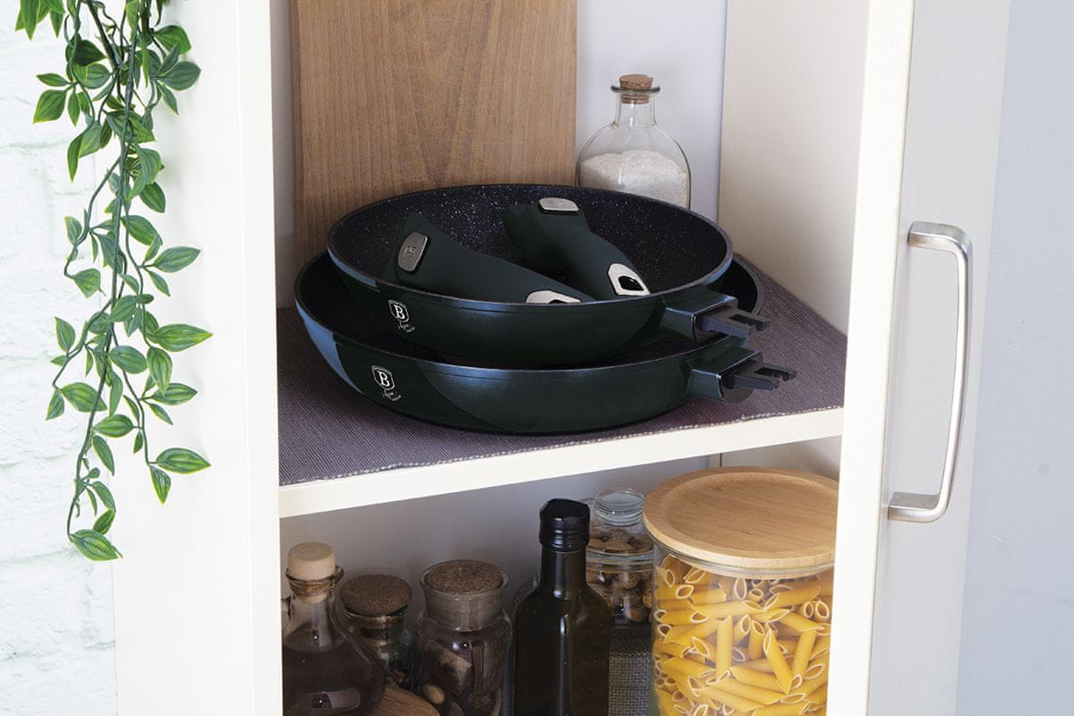 Lonci in dodatki iz serije Aquamarine Edition podjetja BERLINGER HAUS so izdelani iz visokokakovostnega kovanega aluminija, ki je v notranjosti prekrit s trojno granitno (marmorno) prevleko z zelo visokim koeficientom trdote. Zunanji premaz je na voljo v več barvnih različicah z značilnim kovinskim sijajem. Te privlačne in modne posode so serijsko opremljene s silikonskim ročajem SOFT TOUCH. Prilagodljiv za vse vrste štedilnikov: plinski, električni, keramični, halogenski, indukcijski. Sistem TURBO INDUCTION (zelo hitro se segrejejo) omogoča prihranek do 35 % energije.