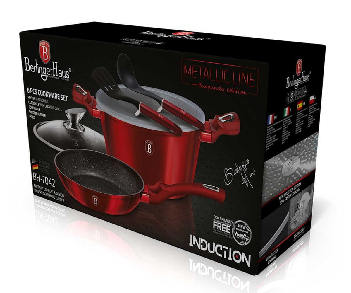 Lončki in pribor serije BURGUNDY podjetja BERLINGER HAUS so izdelani iz visokokakovostnega kovanega aluminija, prevlečenega v notranjosti s trojnim granitnim premazom (marmor) z zelo visokim koeficientom trdote. Zunanja lupina je črna. Te privlačne in modne jedi so standardno opremljene s SOFT TOUCH (silikonskim ročajem). Primerno za vse vrste štedilnikov: plinski, električni, keramični, halogenski, indukcijski. Sistem TURBO INDUCTION (segrejejo se zelo hitro) omogoča prihranek do 35% energije.