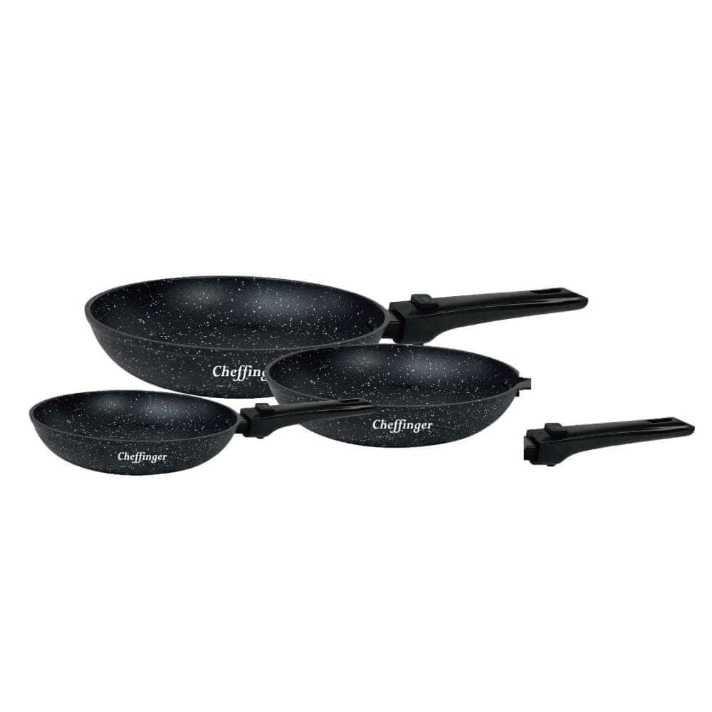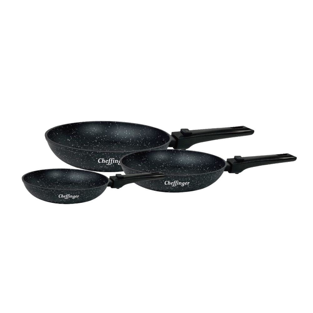 S tem tridelnim kompletom ponev s snemljivimi ročaji je kuhanje lažje kot kdaj koli prej. Te ponve so narejene iz kovanega aluminija in prevlečene s trislojno marmornato površino, zato se ne prijemajo in poenostavljajo kuhanje in čiščenje. Komplet je primeren za vse vire toplote in ga je mogoče pomivati v pomivalnem stroju, zato je vsestranski in praktičen dodatek vsaki kuhinji.