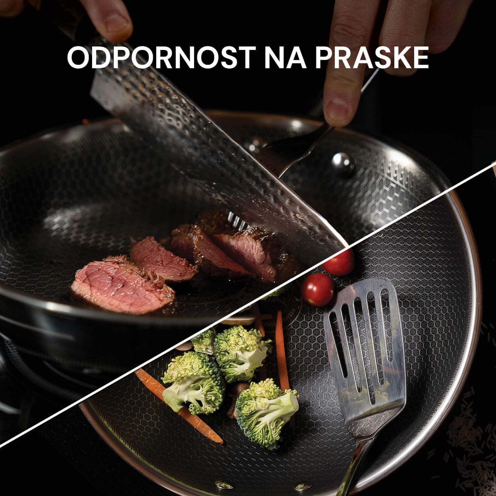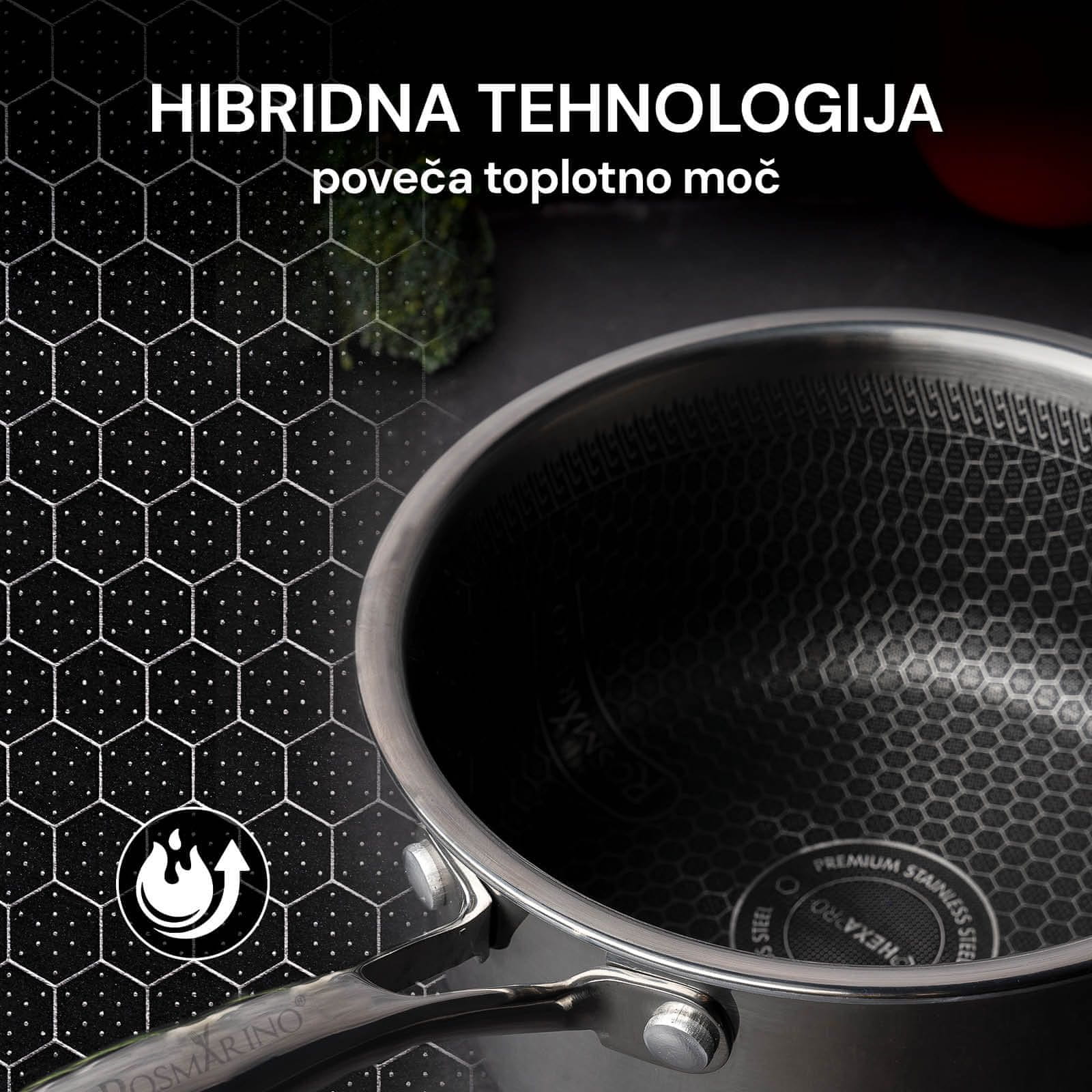 Linija Rosmarino HexaPRO je zasnovana za vse, ki si želijo kuhati kot pravi profesionalci – kar doma. Združuje najboljše lastnosti nerjavečega jekla, aluminija in neoprijemljivega premaza v edinstveni hibridni sestavi, ki omogoča hitro in enakomerno porazdelitev toplote, neuničljivo površino, odporno proti praskam, ter brezhibno kuhanje brez prijemanja hrane. Vrhunski neoprijemljivi premaz s heksagonalno strukturo omogoča kuhanje z minimalno uporabo maščobe, ročaji se pri kuhanju ne segrevajo, posoda pa je primerna tudi za uporabo v pečici do 220 °C. HexaPRO je popolna izbira za vse kuharske entuziaste, ki iščejo vsestranskost, trajnost in vrhunsko kulinarično izkušnjo.