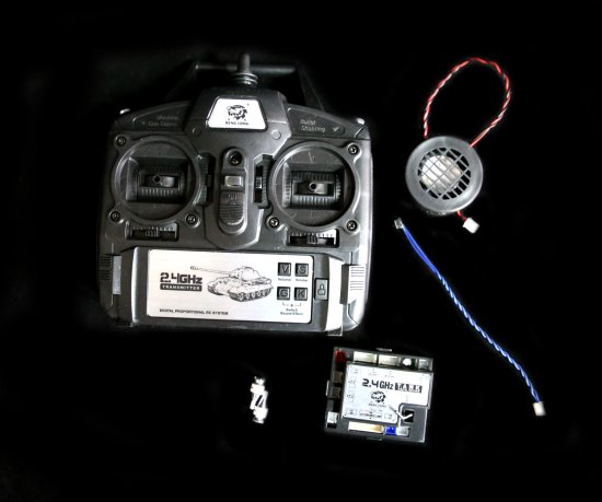 1809-TG2.4 KOMPLET ODDAJNIK + SPREJEMNIK ver. 4 Kompleten oddajnik s sprejemnikom za tanke Heng Long v merilu 1:16 vključuje tudi zvočnik, upravljanje glasnosti in generatorja dima z napravo, proporcionalno vrtenje kupole, trimer smeri gibanja, spremembo zvoka, zaklepanje streljanja komplet vključuje: oddajnik, sprejemnik, zvočnik Količina: 3 deli Barva: črno – srebrna Material: Plastika