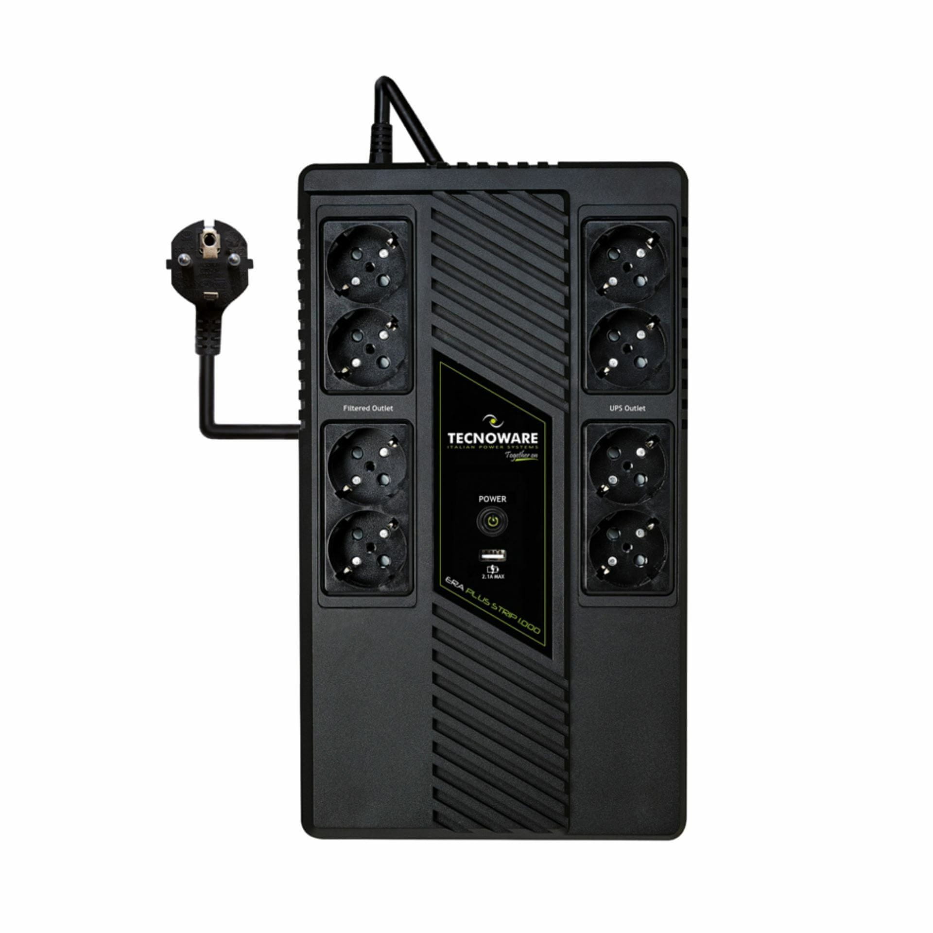 Tecnoware UPS ERA PLUS STRIP 1000VA je sistem brezprekinitvenega napajanja za računalniške naprave z 1000VA/700W nazivne moči. Opremljen je z osmimi „Šuko“ vtičnicami od tega 4 UPS in 4 preobremenitvene. Ponuja do 20 minut delovanja brez napajanja oz. odvisno od obremenitve.