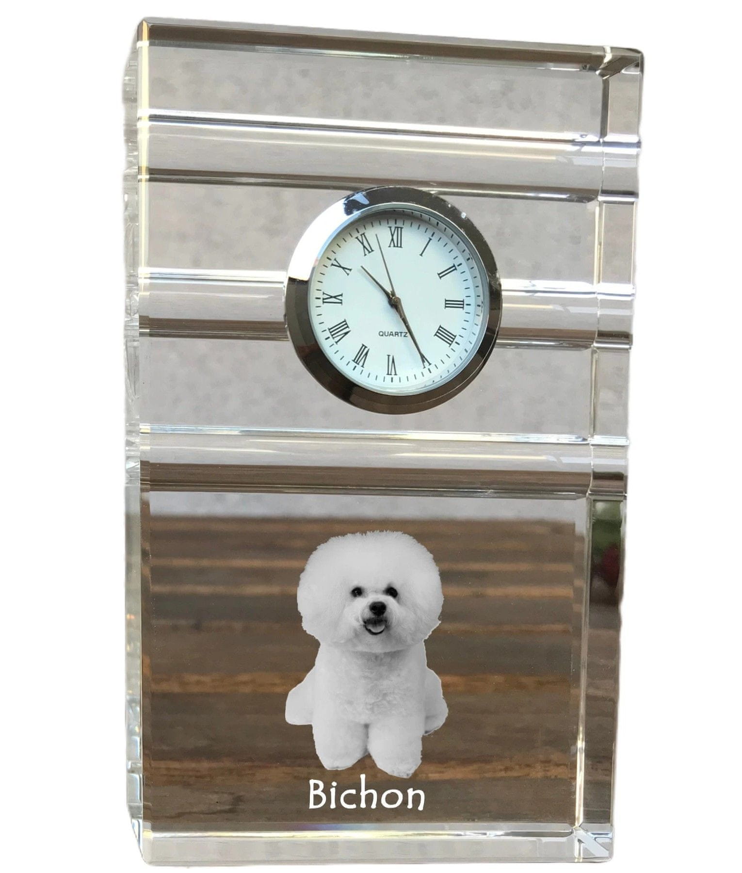Artdog Bichon Frise, Tenerife Dog - steklena ura s fotografijo, fotografija psa v kristalu, personalizirana stoječa ura za pisarno Art-Dog