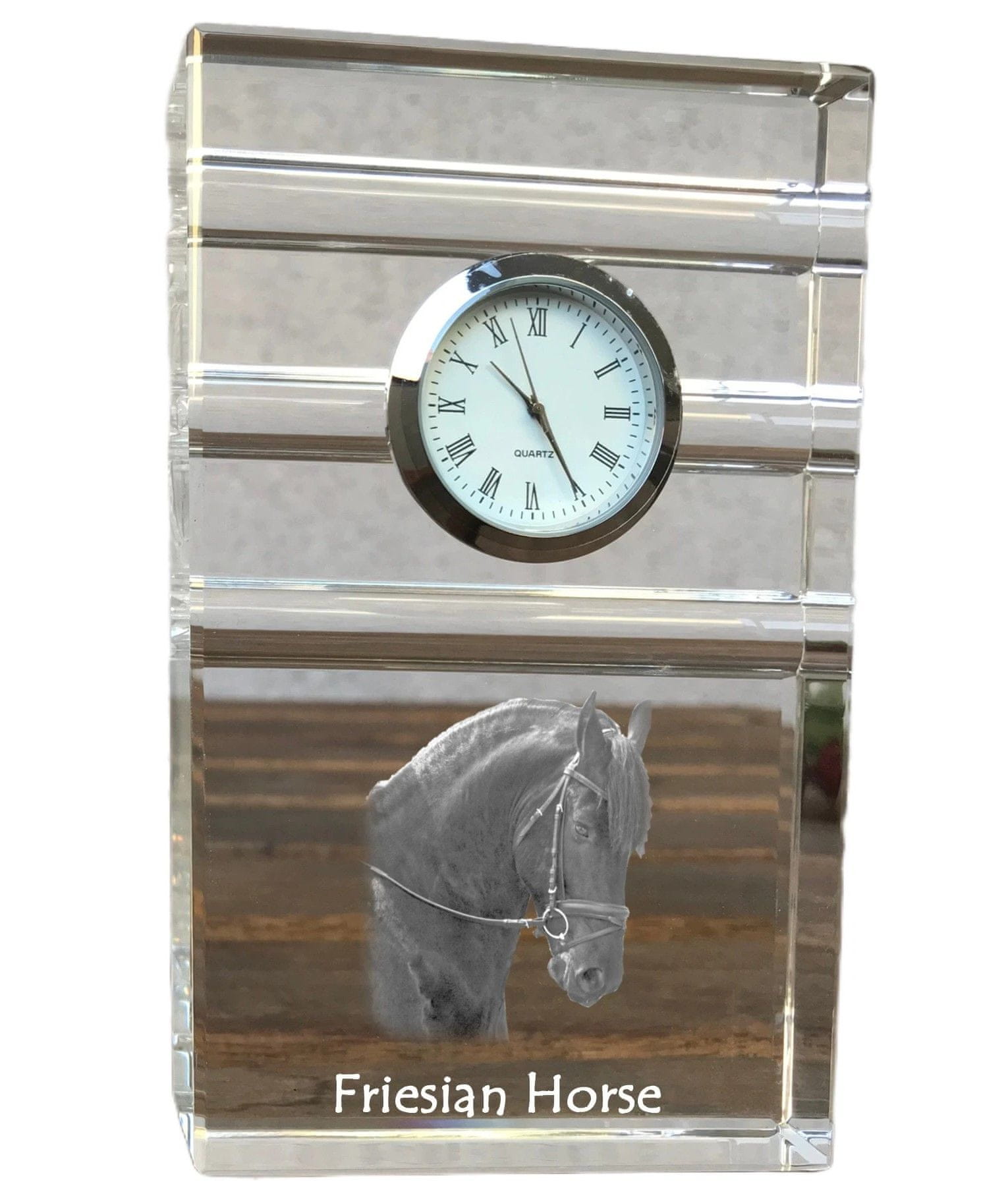 Artdog Frizijski konj - steklena ura s fotografijo, fotografija konja v kristalu, personalizirana stoječa ura za pisarno Art-Dog