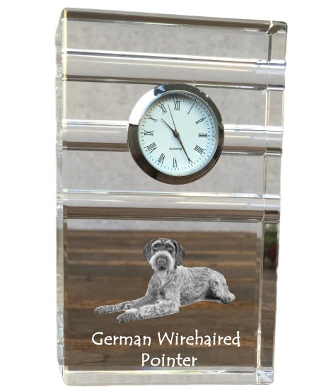 Artdog Nemški oštrodlaki ptičar, Drahthaar - steklena ura s fotografijo, fotografija psa v kristalu, personalizirana stoječa ura za pisarno Art-Dog