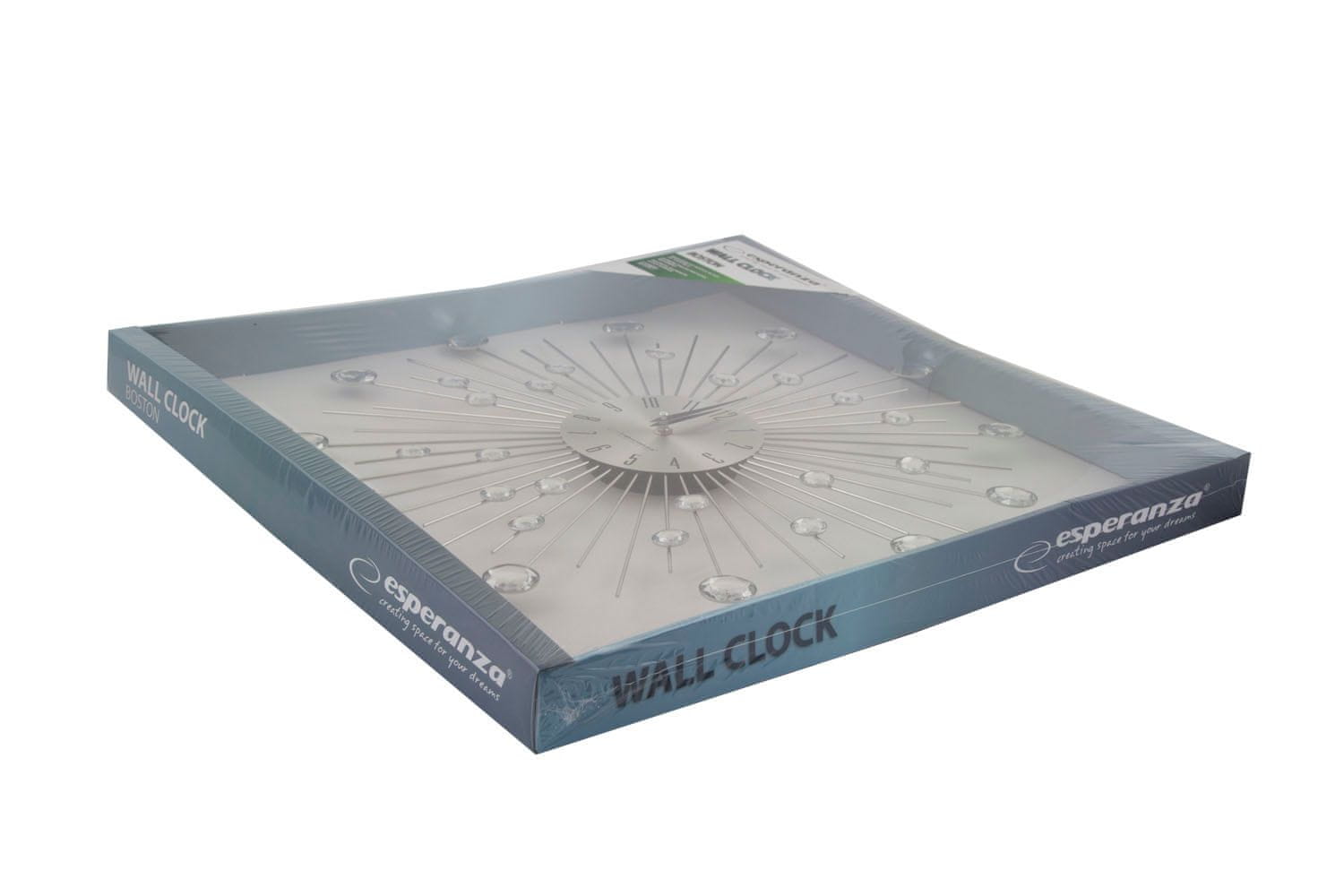 Stenska ura ESPERANZA BOSTON prinaša s svojo sofisticirano obliko v prostor pridih elegance in razkošja. Osupljivi kristali okrašujejo ‚žarke‘ iz jekla, ustvarjajoč neprekosljiv vizualni učinek, ki preobrazi vsak ambient v sodobni umetniški izraz. Ura s premerom 50 cm in številčnico s premerom 13,5 cm je popolno sorazmerna ter predstavlja funkcionalen in estetski kos dekorja. Sprednja stran in kazalci iz aluminija dajejo pridih modernosti, medtem ko akrilni kristali v dveh različnih velikostih – 2 cm in 3 cm – izžarevajo glamurozen sijaj. Dolžina ‚žarkov‘ je 35,5 cm, celotna ura pa je debela samo 2,5 cm, kar zagotavlja lahkotno in subtilno prisotnost na steni. Ura deluje na enostavno dostopno baterijo AA, kar omogoča praktično in enostavno uporabo. Popolna za vse, ki cenijo prefinjenost in želijo obogatiti svoje prostore z izvrstnim kosom oblikovalske umetnosti.
