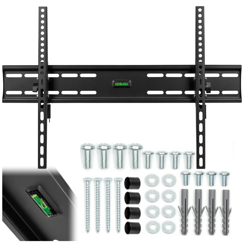 v elegantni črni barvi. Popolnoma se bo podal v vzdušje vaše dnevne sobe, pisarne, restavracije, letališča ali drugega javnega prostora in dodal eleganco. Trdna montažna plošča enakomerno porazdeli težo televizorja, kar je ključnega pomena za varnost in stabilnost naprave na steni. ✴️Montaža brez nepotrebnih stroškov – celoten komplet za namestitev je priložen✴️ Pripravili smo vse, kar potrebujete, da lahko nosilec hitro in enostavno namestite takoj po razpakiranju.