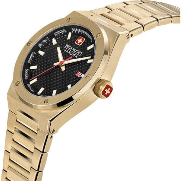 Luksuzna ura Swiss Military Hanowa navdušuje s svojim elegantnim dizajnom. Ponaša se z natančno izdelavo. Ohišje je tako kot mehanizem izdelano iz nerjavečega jekla z zlatim zaključkom. Številčnica ima potreben prikaz datuma na klasični tretji poziciji. Celoten opis