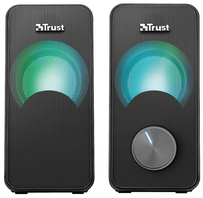 Jednoduché k použitíReproduktory můžete umístit kamkoli díky velmi kompaktnímu designu a stylové kovové mřížce. Skvěle doplní každý pracovní stůl. Jakmile je zapojíte, rozsvítí se a automaticky začnou měnit barvy. Ovladač umístěný na přední straně pravého reproduktoru Vám umožní jednoduché nastavení hlasitosti. |