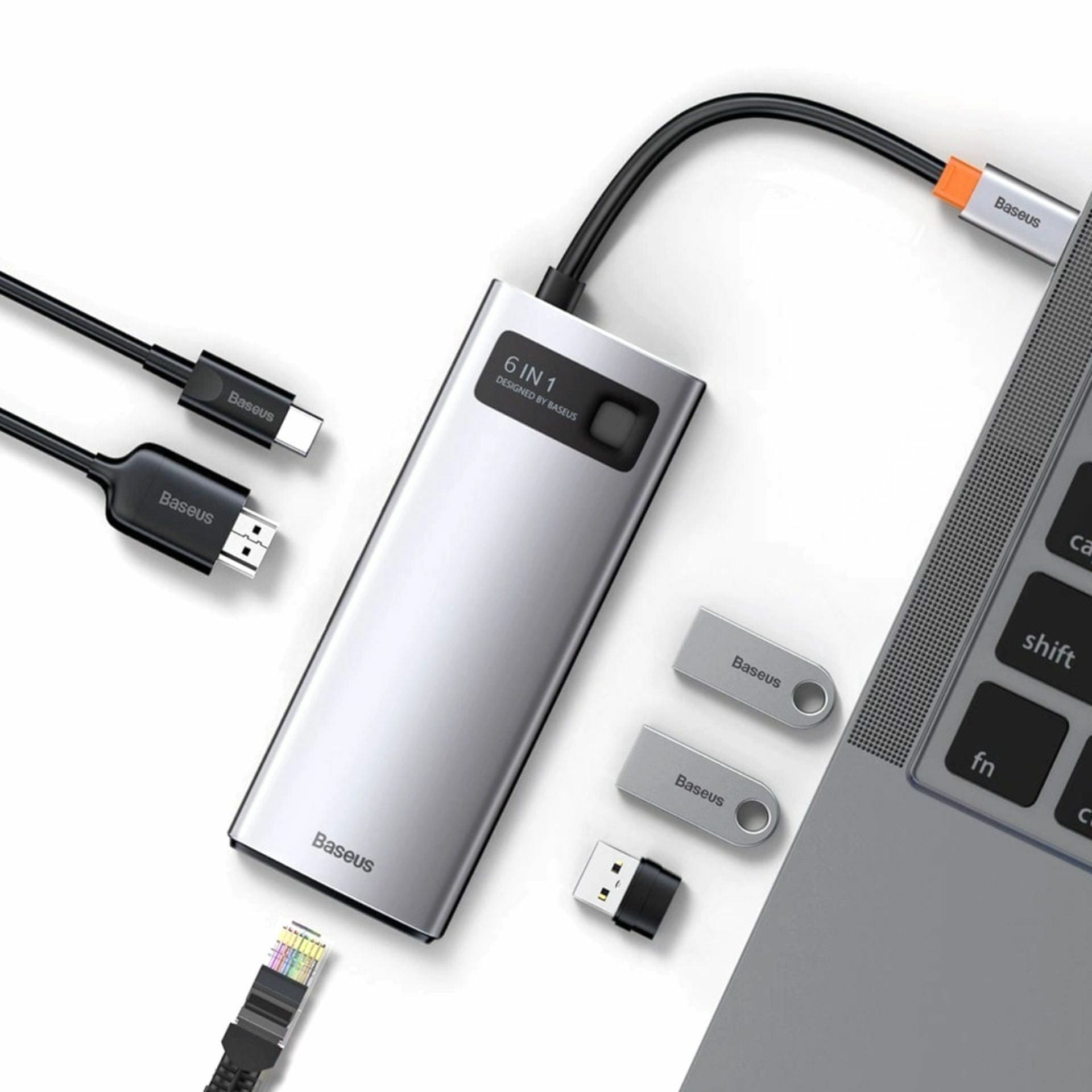 Priklopna postaja Baseus CAHUB-CW0G je zanesljivo orodje, ki vam bo pomagalo pri učinkovitejšem delu. Kar 6 razpoložljivih vhodov, možnost hitrega polnjenja naprave preko TipC, HDMI podpora ločljivosti 4K, Giga RJ45 priklop in 3.0 USB prenos podatkov do 5 GB/s.