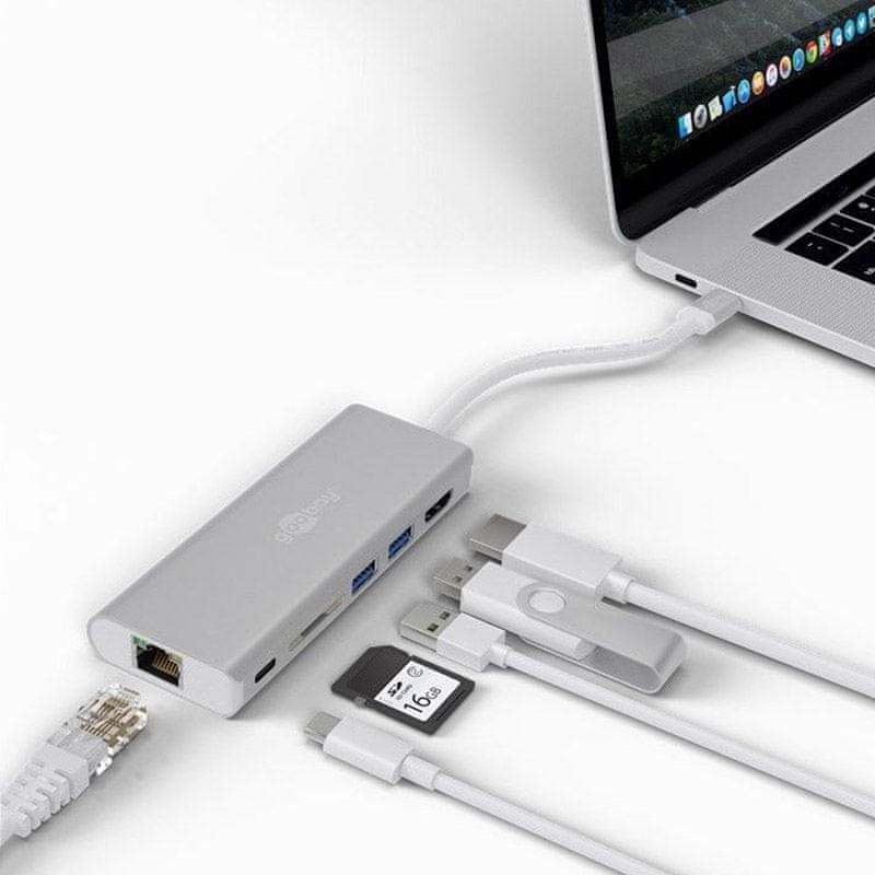 Goobay multi adapter doda USB-C napravi dodatne priključke: mrežni priključek, HDMI priključek, 2 USB 3.0 priključka, USB-C priključek in režo za SD kartico.