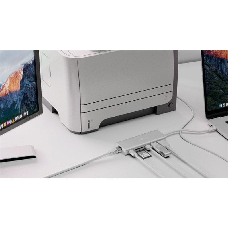 Adapter zrcali signal iz USB-C na HDMI in USB naprave. Podpira HDMI ločljivost do 4kx2k @ 30Hz. Na voljo je USB-C priključek za hitro polnjenje in prenos podatkov do 5 Gbps. Podpira SD spominske kartice. Poleg tega nudi tudi mrežni priključek za hitro mrežno povezavo in 2× USB-A priključka za hiter prenos podatkov in polnjenje. Adapter je primeren tudi za MacBook in MacBook Pro.