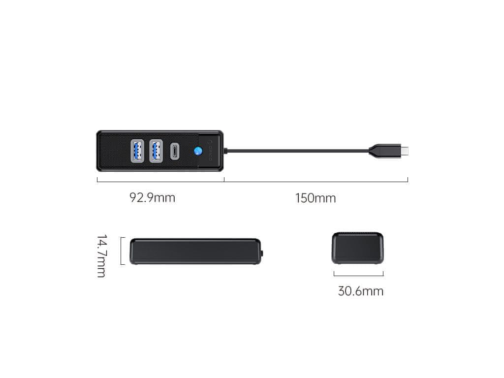 Orico PWC2U-C3-015 USB-C na 1x USB-C in 2x USB-A 3.0 hub, črn