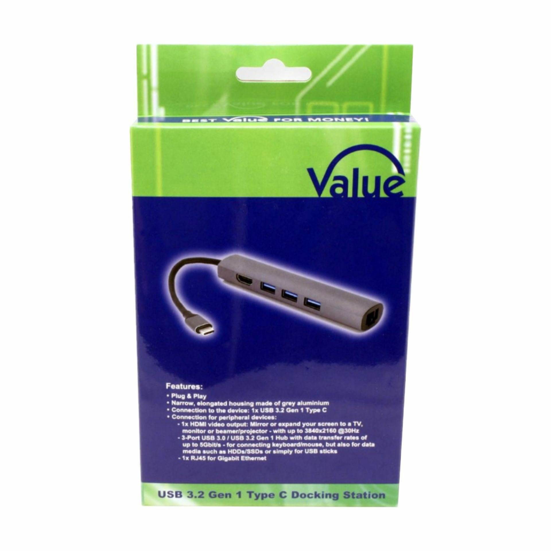 Value pretvornik USB 3.2 Gen1 Tip-C docking station omogoči vašemu prenosniku 5 dodatnih priključkov samo z uporabo enega USB Tip-C priključka. Priklopna postaja ponuja video vmesnik (HDMI). Prav tako ponuja tri USB 3.2 Gen1 tip-A priključke in pa gigabitni RJ45 priključek za mrežno povezavo.