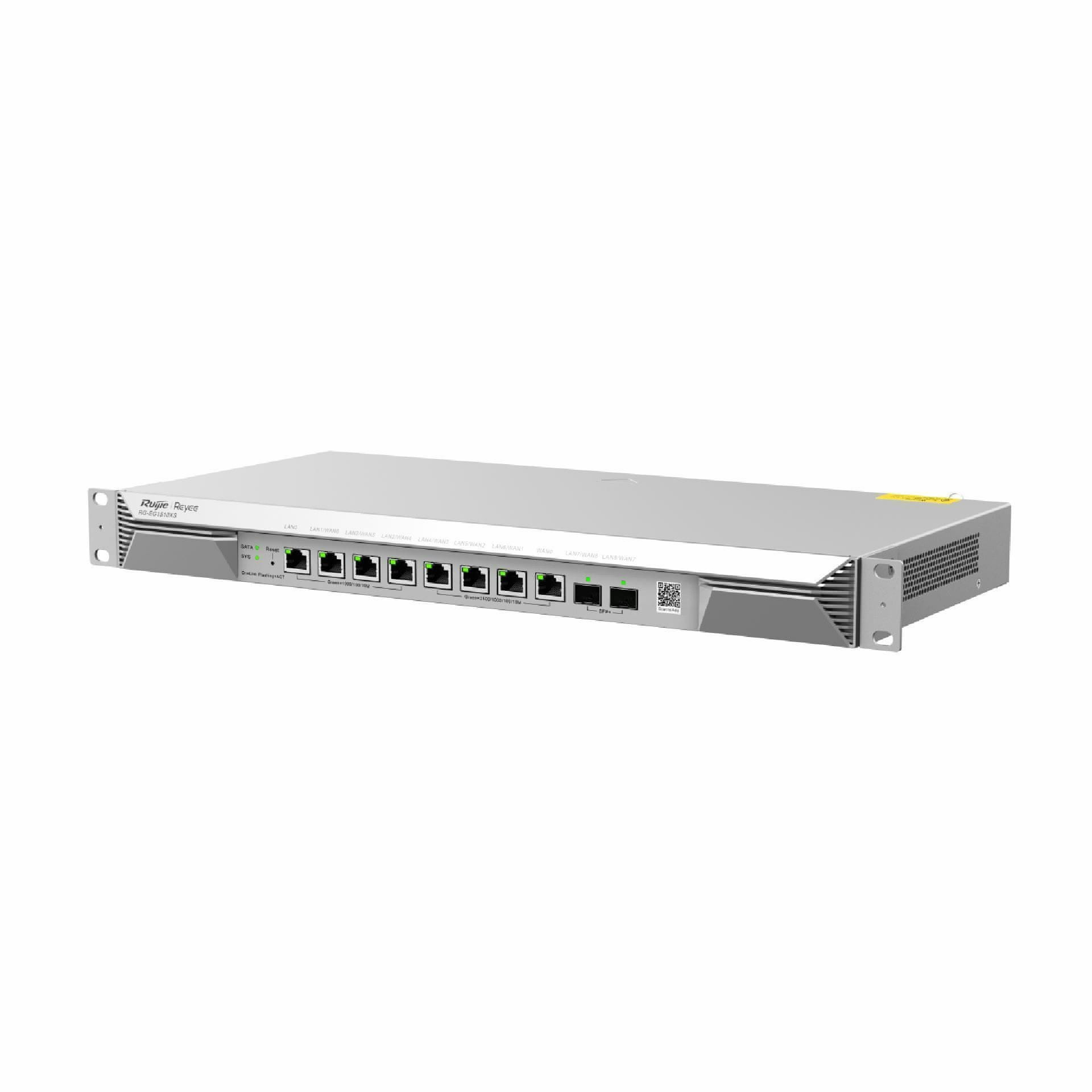 Ruijie Reyee RG-EG1510XS je zmogljiv usmerjevalnik za do 1500 uporabnikov. Podpira optične hitrosti do 10 Gbps (SFP+), vgradnjo 2.5'' 1TB SATA HDD diska za shranjevanje in zagotavlja stabilno žično povezavo. Podpira dva WAN vmesnika in lahko deluje v hot standby načinu za neprekinjeno delovanje omrežja.