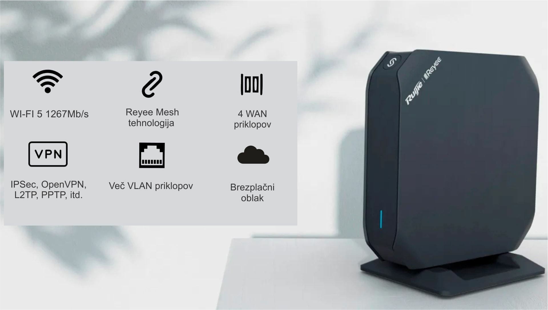 Naprava podpira standard Wi-Fi 5 (802.11ac Wave2), kar omogoča hitrost do 1267 Mb/s. CPU z dvojnimi jedri, ki deluje pri frekvenci 880 MHz, dodatno ga podpira 256MB DDR3 RAM-a, kar zagotavlja gladko delovanje tudi ob večjih obremenitvah. Za optimalno zmogljivost v različnih frekvenčnih pasovih naprava uporablja tehnologijo MIMO: 2×2 @ 2.4 GHz in 2×2 @ 5 GHz. Maksimalno število porabnikov, ki jih lahko naprava podpira, je 80 (brezžičnih). Ponuja priklope 1× WAN (10/100/1000 Base-T Port) in 4× LAN (10/100/1000 Base-T Port). Za dodatno varnost in prilagodljivost, naprava vključuje napredne tehnologije, kot so IPSec, OpenVPN, L2TP in PPTP. Dodatna posebnost je funkcija One-Click Reyee Mesh, ki olajša vzpostavljanje povezave na druge naprave z enostavnim pritiskom na gumb (za več informacij o vzpostavitvi poglejte v navodila pod POVEZAVE Z ENIM KLIKOM). Napajanje naprave je zagotovljeno preko DC 12V/1.5A napajalnika. Z aplikacijo Reyee Router App pa lahko omrežje enostavno upravljate kar preko pametnega telefona.