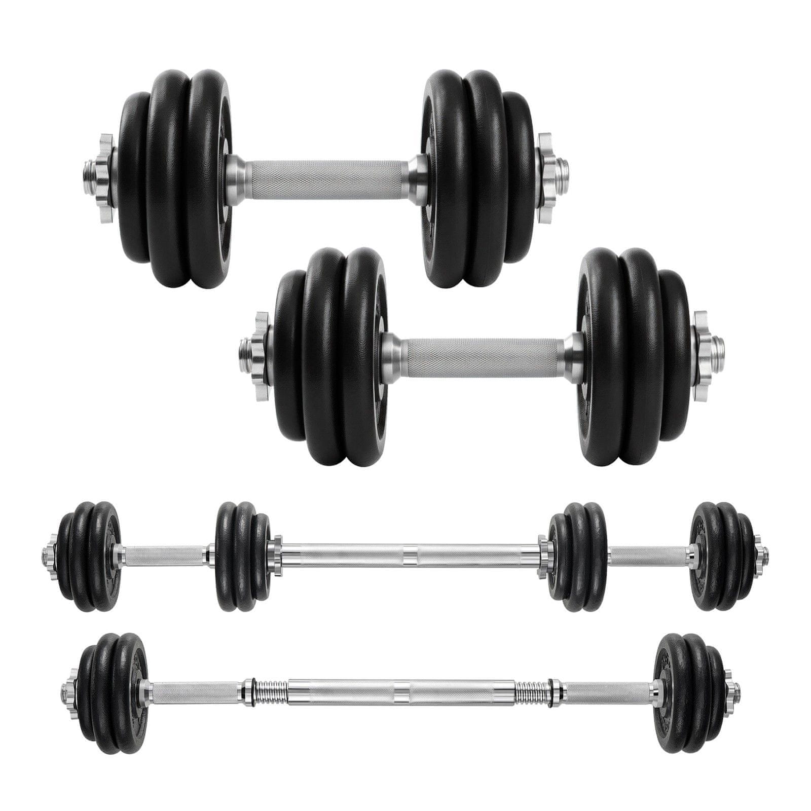Ta nastavljiv komplet plastičnih uteži je zasnovan za vsestranski trening moči doma. Uporabnikom omogoča prilagajanje intenzivnosti vadbe z enostavnim združevanjem različnih utežnih plošč zaradi česar je primeren za različne vaje. Vključen jekleni spojni drog omogoča hitro preobrazbo iz uteži v palico kar ponuja več možnosti treninga za različne mišične skupine.