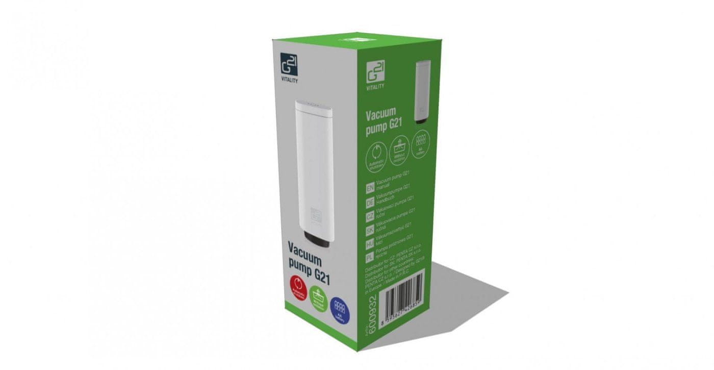 Kako podaljšati svežino in rok trajanja živil ter ohraniti njihovo svežino, poln okus in aromo? Ročna vakuumska črpalka G21 omogoča hitro in enostavno vakuumsko pakiranje v kozarce, vrečke ali steklenice. S tem lahko večkrat podaljšate rok uporabe.