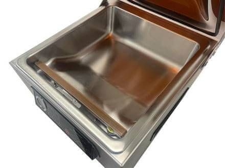 Vakuumski pakirni stroj VM Chamber Line 90 Gastro je primeren za zelo intenzivno komercialno uporabo: *enostavno in hitro vakuumira ne le trdno in suho hrano, temveč tudi vlažno in mokro hrano ter celo TEKOČINE – JUHE, OMAKICE itd. *sesa zunaj komore, sesa velike količine