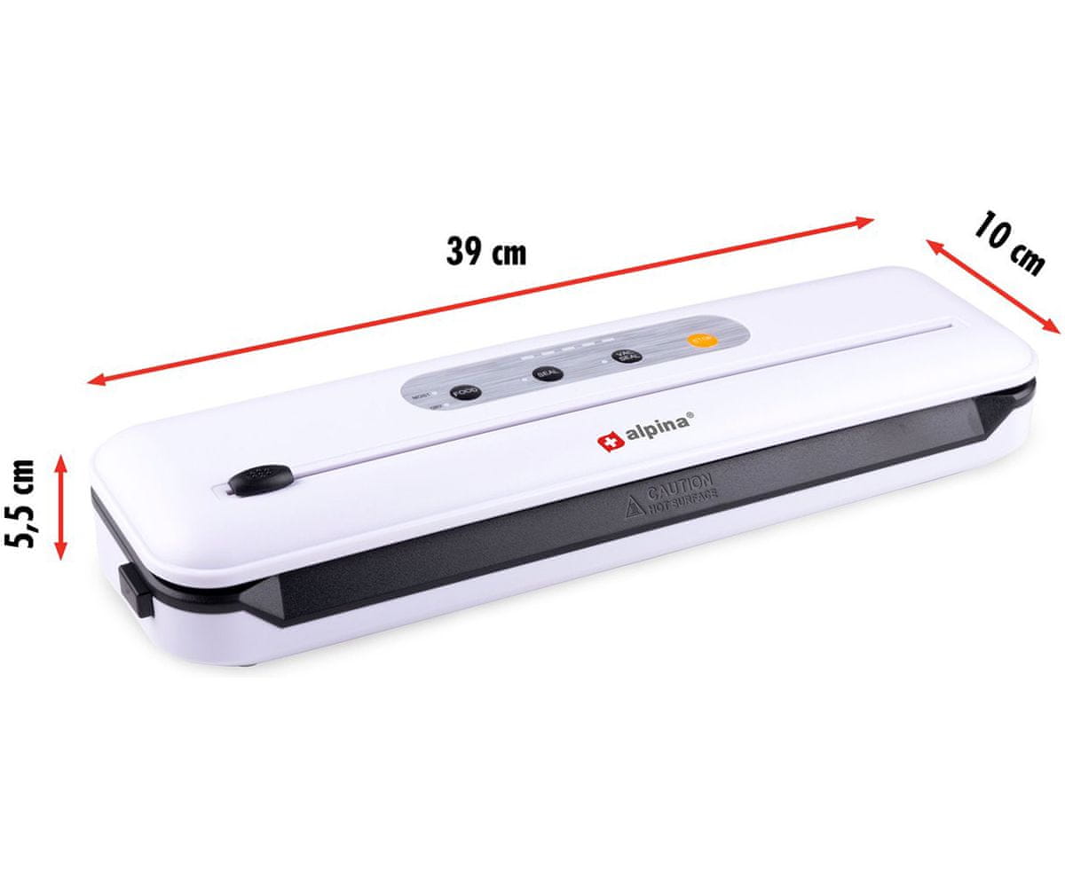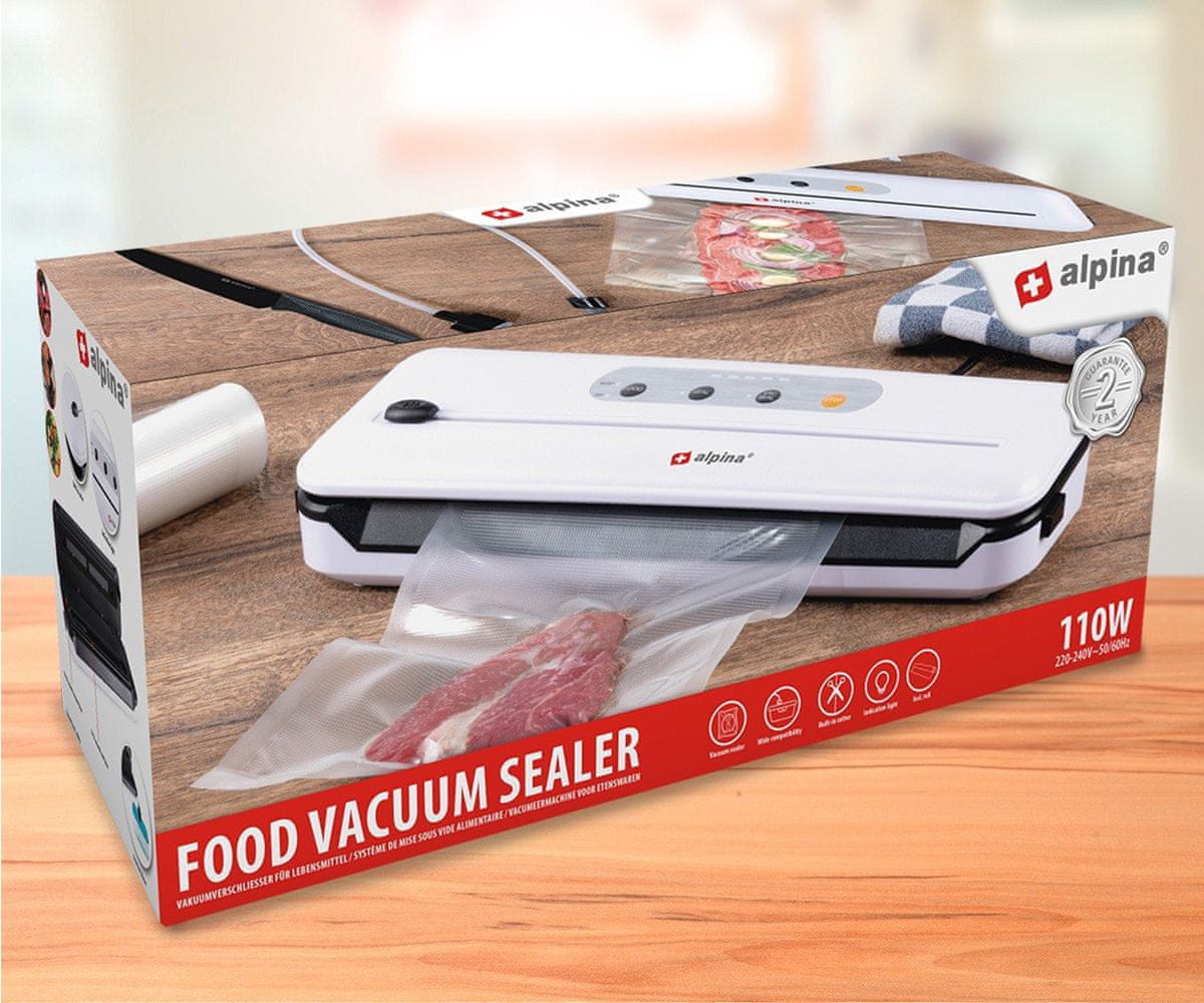 Z vakuumskim aparatom Alpina dobite priloženo rolo plastike za vakuumsko zapiranje velikosti 20 × 200 cm. Sama naprava je enostavna za upravljanje z gumbi na dotik na vrhu. Vgrajen rezalni mehanizem lahko upravljate z drsnikom na napravi. To vam omogoča, da vakuumske vrečke razrežete na želeno velikost v 1 gibu.