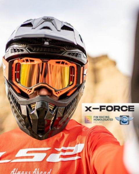 Premium motocross čelada LS2 X-Force carbon (MX703) postavlja nove meje v svetu motocross čelad s svojim dizajnom, materiali in zaščito. Karbonska motokros čelada je v ustaljen svet visoko zmogljivih MX, enduro, supermoto in čelad za štirikolesnike pripeljala nove tehnologije in materiale. S svojimi ekstremnimi in inovativnimi lastnostmi je zasidrana najvišje na področju udobja, izgleda ter posebej na področju varnosti, saj dosega standarde ECE 22.06.