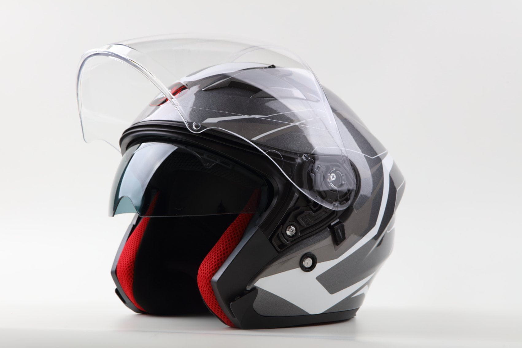 Odprta čelada z integriranim senčnikom. HIGH TECH termoplastična ABS lupina s pleksi steklom v obdelavi proti praskam primerna za čoperje in skuterje. ECE R2205 homologacija. Popolnoma odstranljiva in pralna antialergijska podloga. Pritrdilni trak s hitro sprostitvijo.