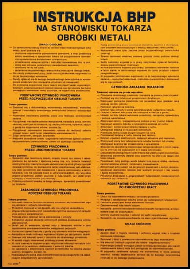 Navodila za varnost in zdravje pri delu za delovno mesto strugarja kovin so dokument, ki vsebuje smernice in načela za varno delo med obdelavo kovin na stružnici. PVC znak velikosti L (250 × 350 cm) obvešča o veljavnih navodilih za varnost in zdravje pri delu za določeno delovno mesto. Namen teh navodil je zmanjšati tveganje za nesreče pri delu in zagotoviti varnost zaposlenih.