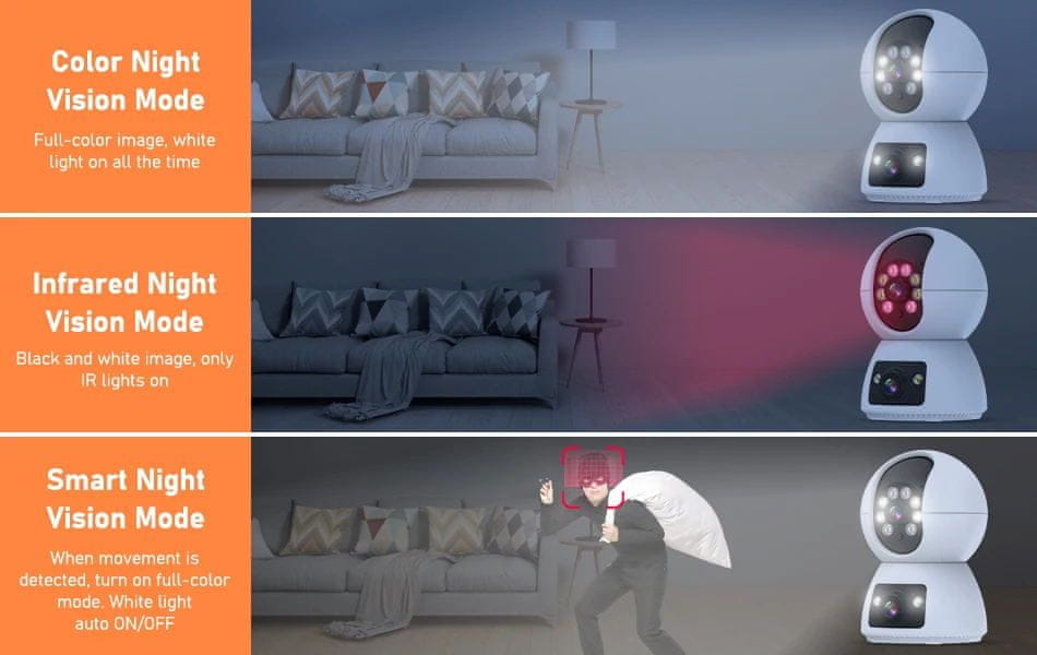 Njena 355-stopinjska horizontalna rotacija in 90-stopinjska vertikalna rotacija zagotavljata, da ne boste zamudili nobenega pomembnega trenutka. Poleg tega lahko z daljinskim glasovnim upravljanjem preprosto in udobno upravljate kamero, ne da bi zapustili območje udobja. Ne glede na to, ali želite nadzorovati svoje hišne ljubljenčke, otroke ali preprosto poskrbeti za varnost svojega doma, je kamera NA3 prava izbira.