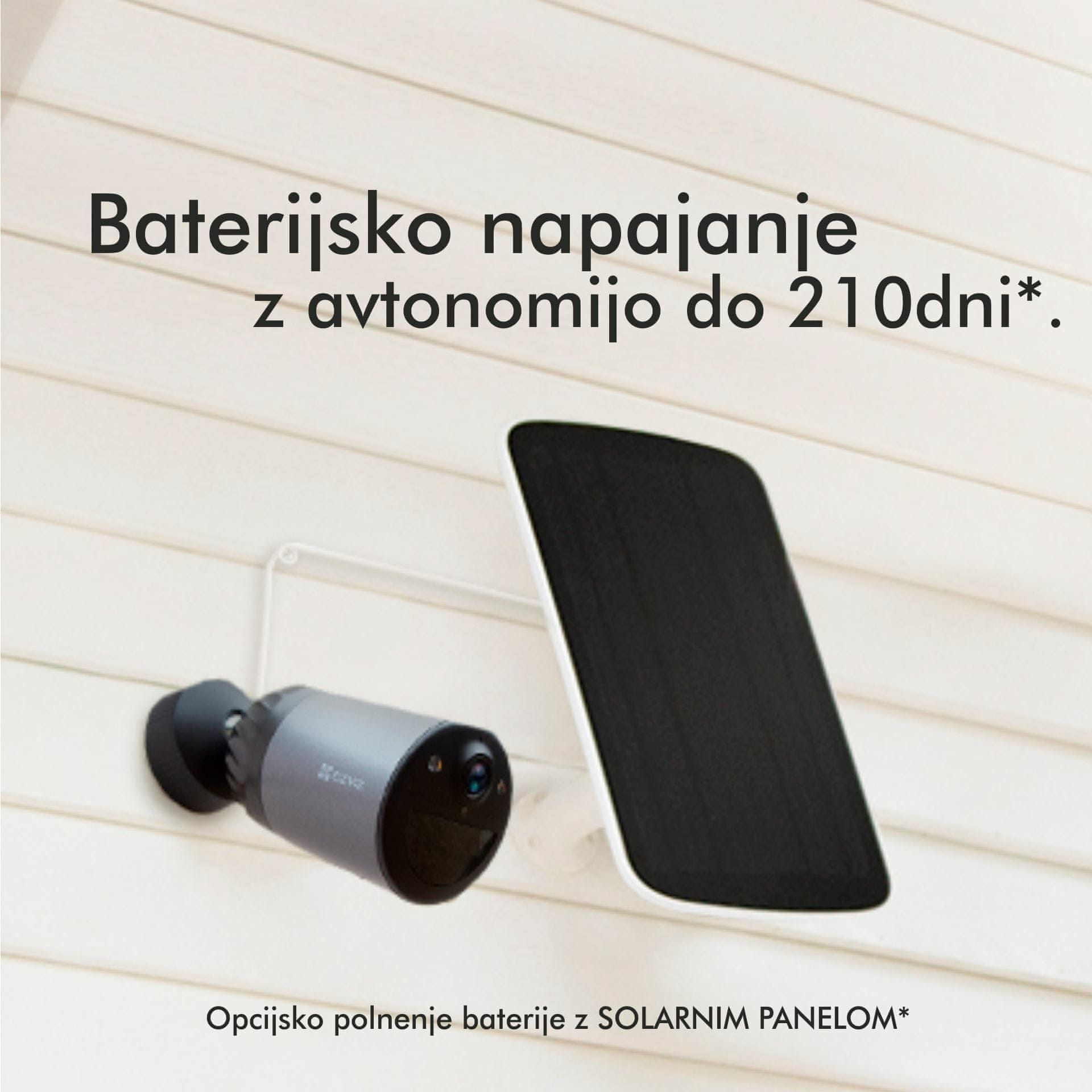Zunanja brezžična IP kamera je namenjen za video nadzor EZVIZ za domačo rabo. Zasnovana z 4MP senzorjem ter vidnim kotom H107°, D125°. Vgrajen akumulator kapacitete 7800mAh poskrbi za delovanje kamere do 210 dni z enim polnjenjem.