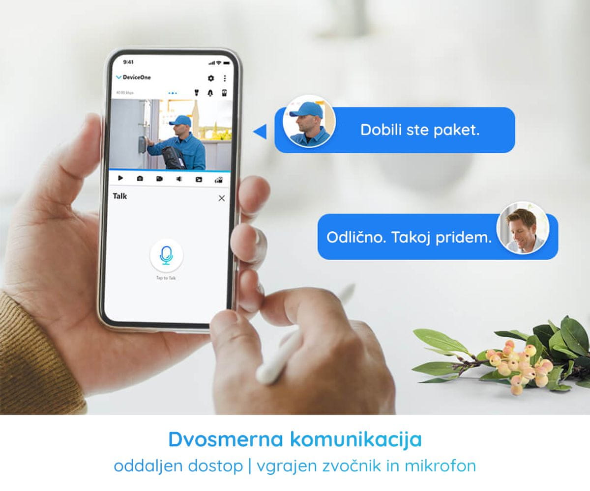 Z vgrajenim mikrofonom in zvočnikom lahko prosto poslušate in se pogovarjate s tistim, ki ga kamera ujame, v realnem času! Uporabna funkcija, ko vas ni doma, ali ne veste, kdo stoji pred vrati. Komunikacija na daljavo še nikoli ni bila tako enostavna.