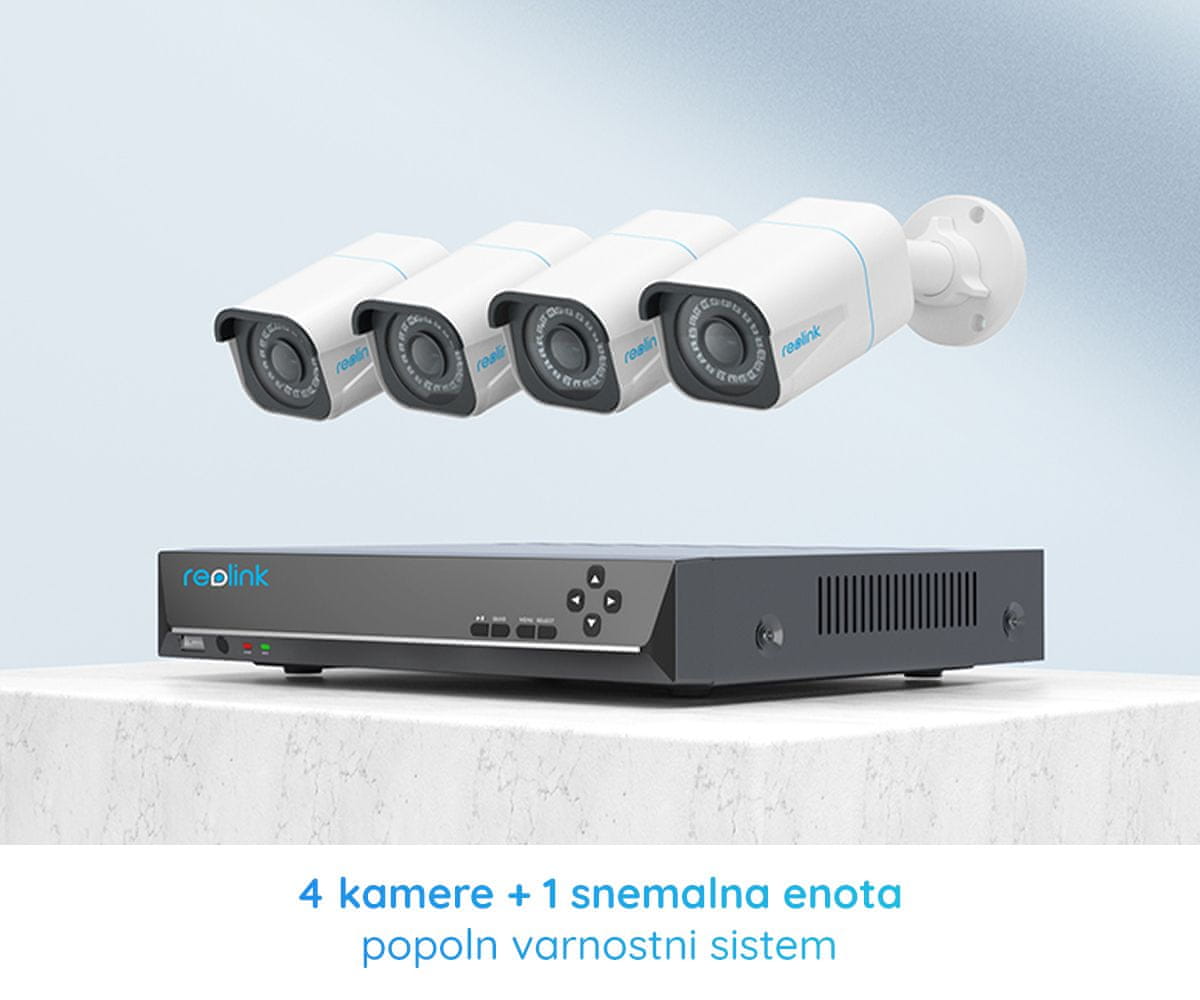 Set v pakiranju vključuje 4 kamere B800, 1 snemalno enoto RLK8–410, ter vse potrebne dodatke in kable za hitro namestitev. Na snemalno enoto lahko priklopite do 8 kamer Reolink.
