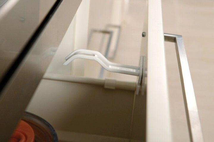 Preprečuje otrokom, da bi popolnoma odprli omarico ali predal, kar zagotavlja višjo raven varnosti.