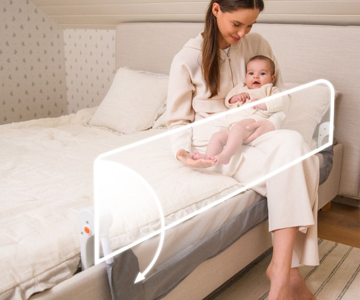 Nastavitev odpiranja za 180°, da starši udobno vstanejo iz postelje, in enostavno spuščanje, ko ograja ni v uporabi, in je ni treba razstavljati.
